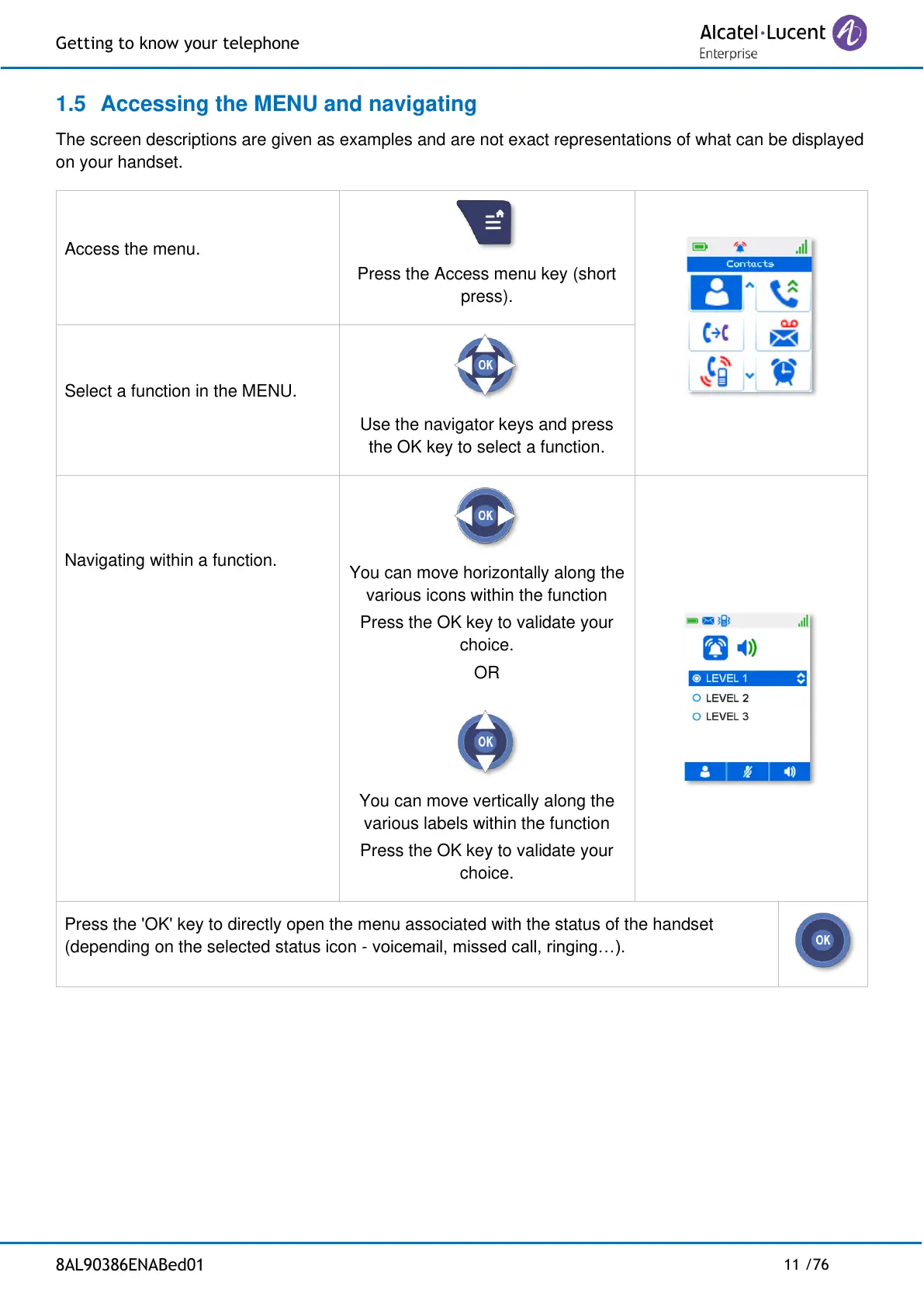 Press the 'OK' key to directly open the menu associated with the status of the handset