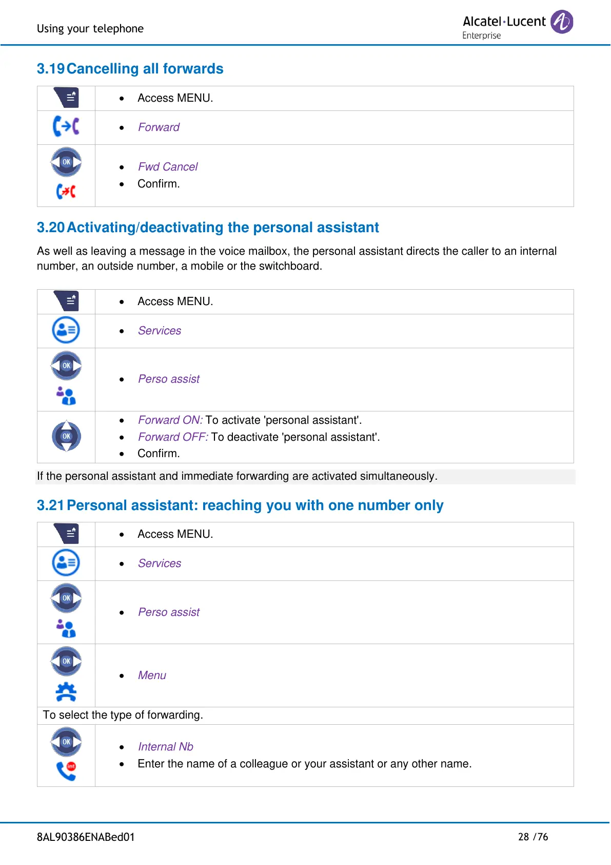 • Forward ON: To activate 'personal assistant'.