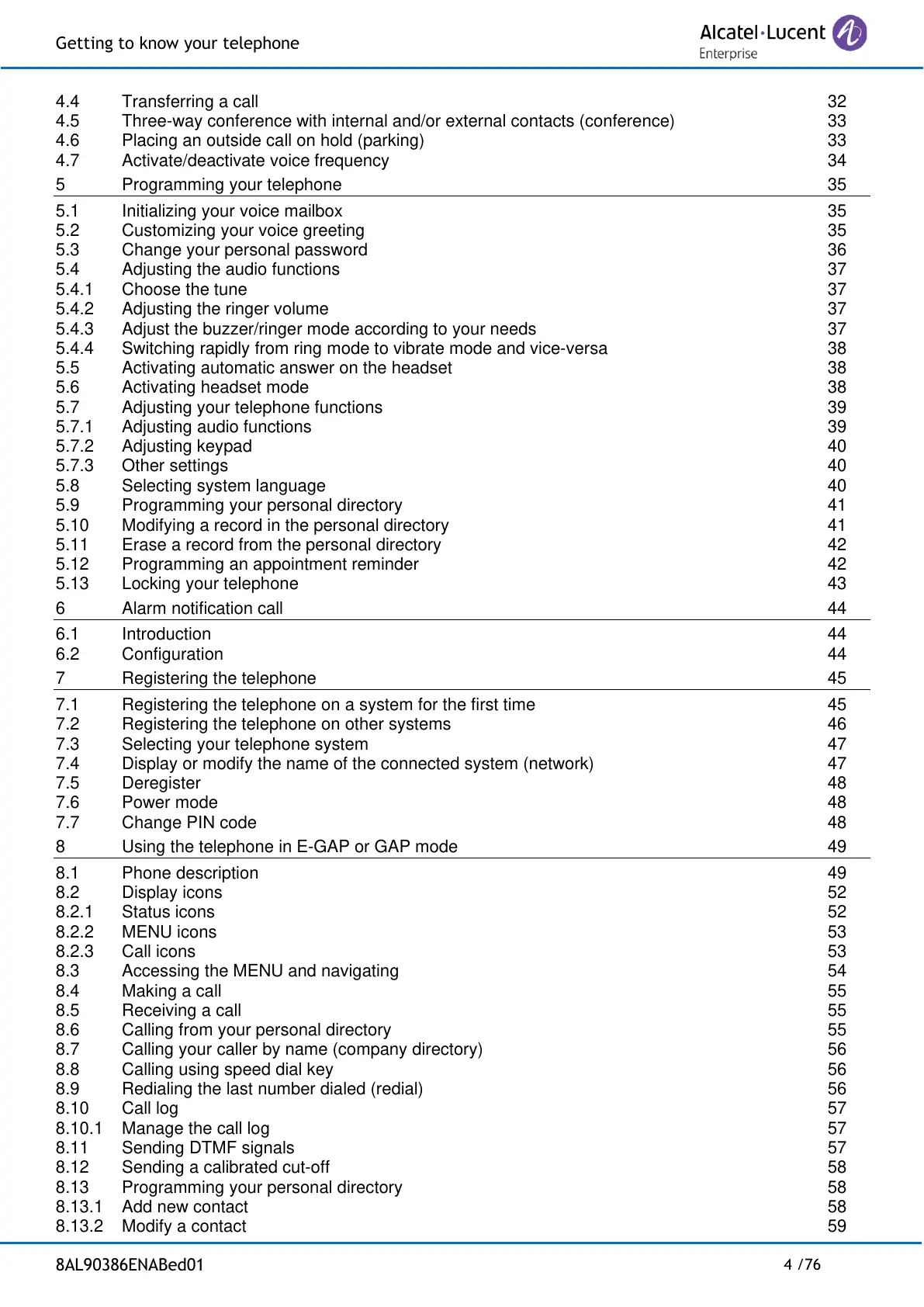 7.1 Registering the telephone on a system for the first time 45