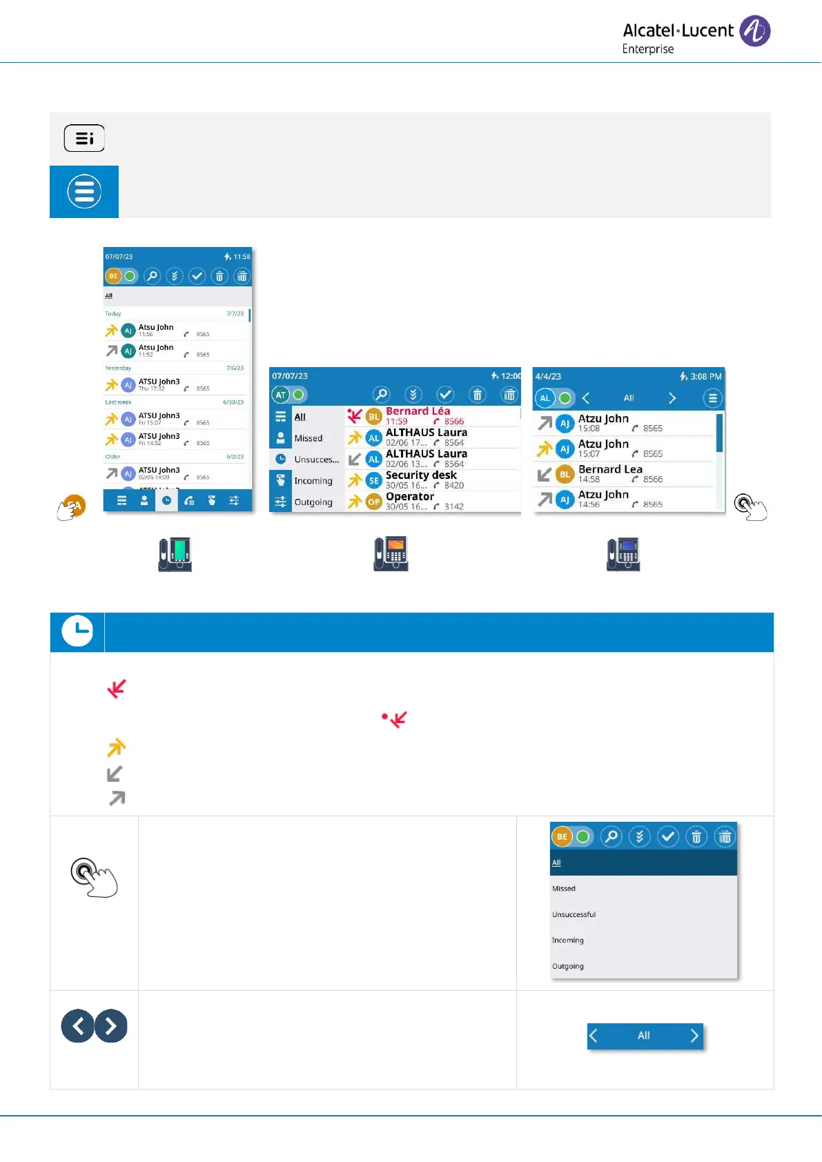 • : missed calls. A red dot is displayed alongside the missed call icon if an incoming