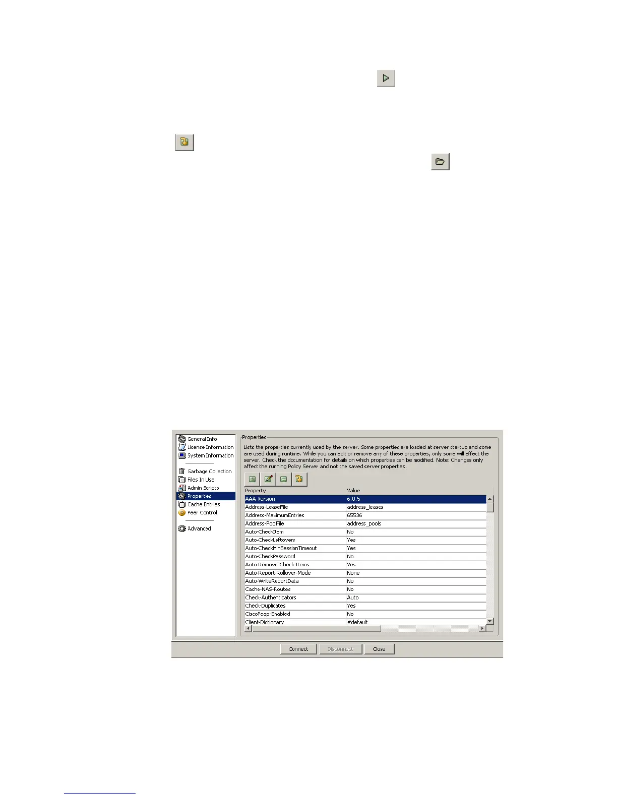 The screen allows the user to display, edit, add, and remove properties from the list. Server
