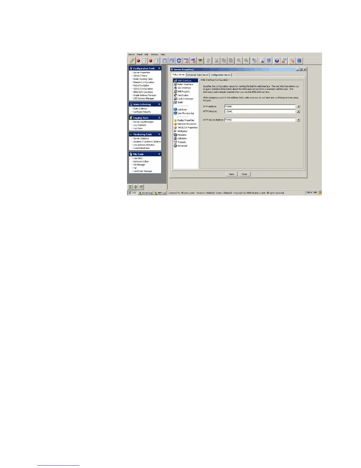 Use the Server Properties panel to control the behavior of the 8950 AAA servers including