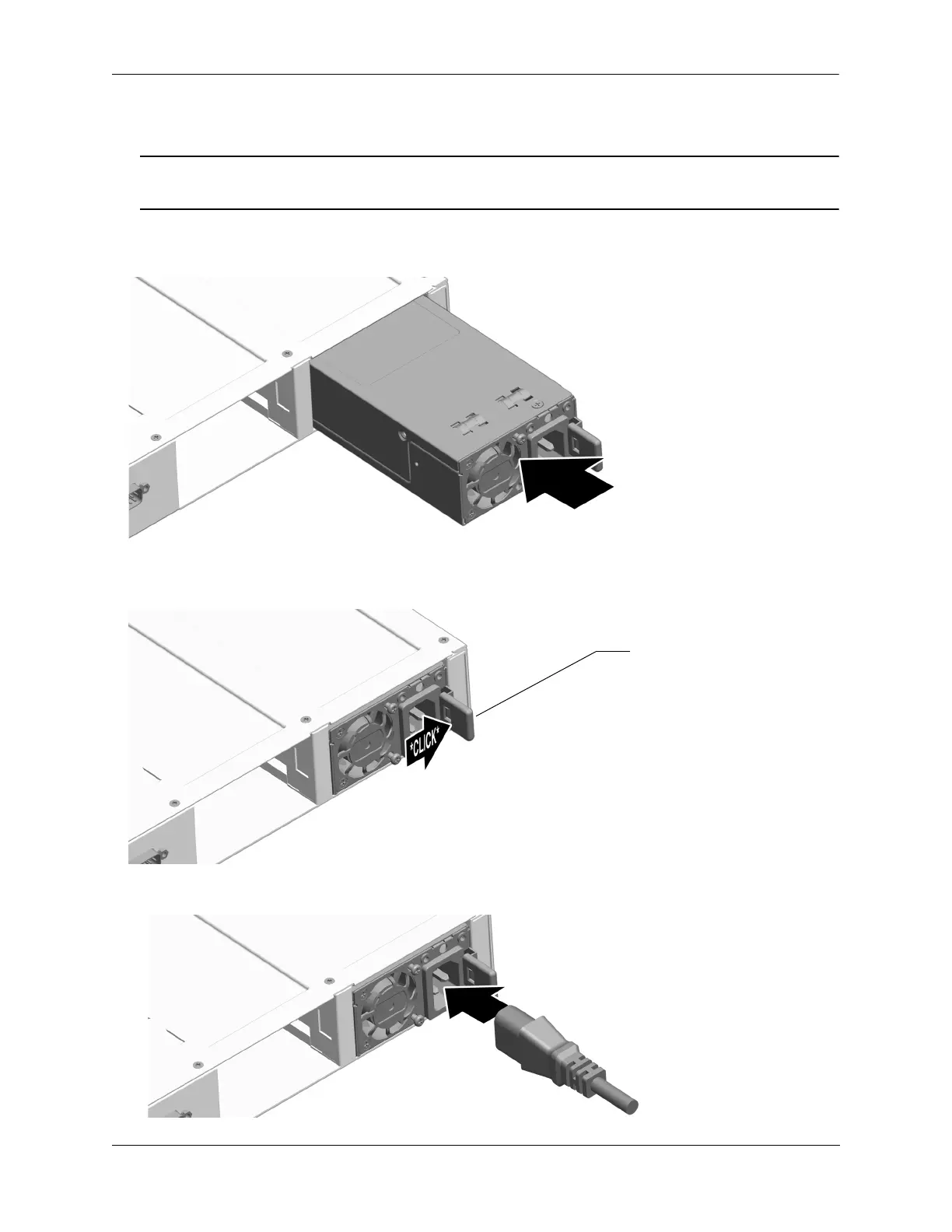 1 Insert the power supply into a power supply bay at the rear of the chassis and slide it back until it is