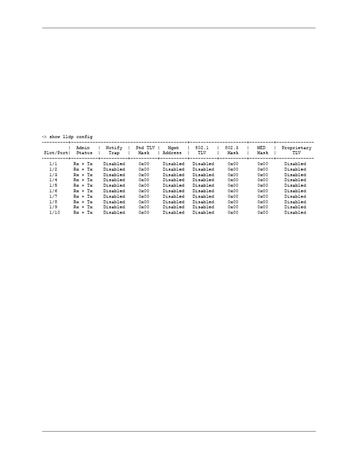 To view the operational status of Proprietary TLV on a switch, use the show lldp config command.