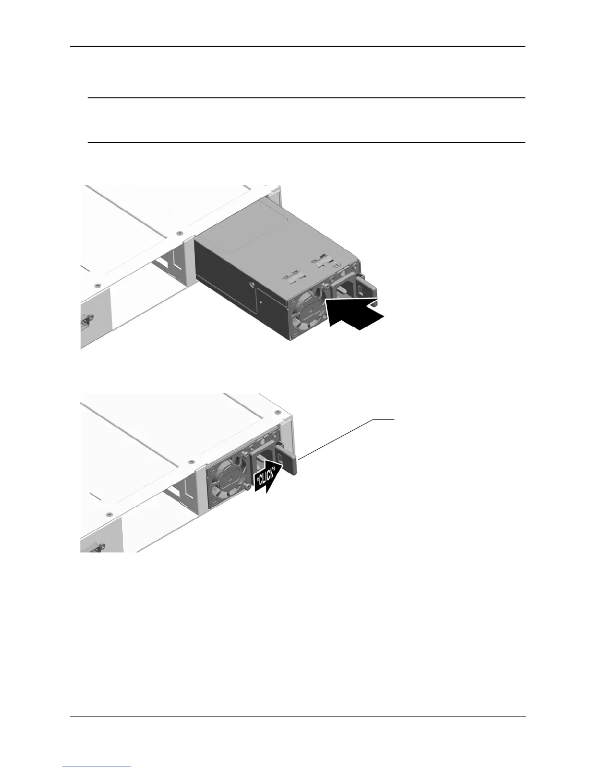 1 Insert the power supply into a power supply bay at the rear of the chassis and slide it back until it is