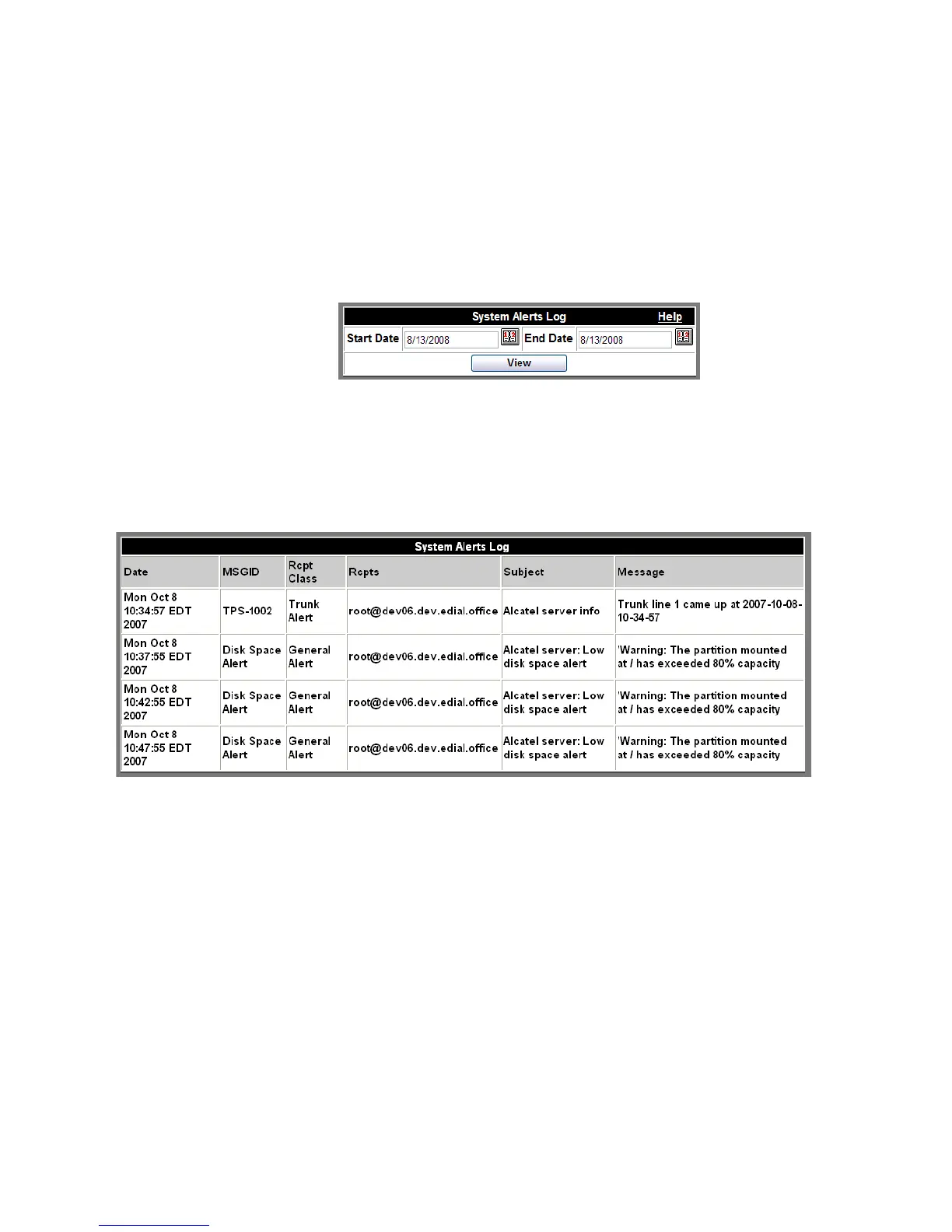A list of system alerts that have been sent to the System Administrator, similar to the