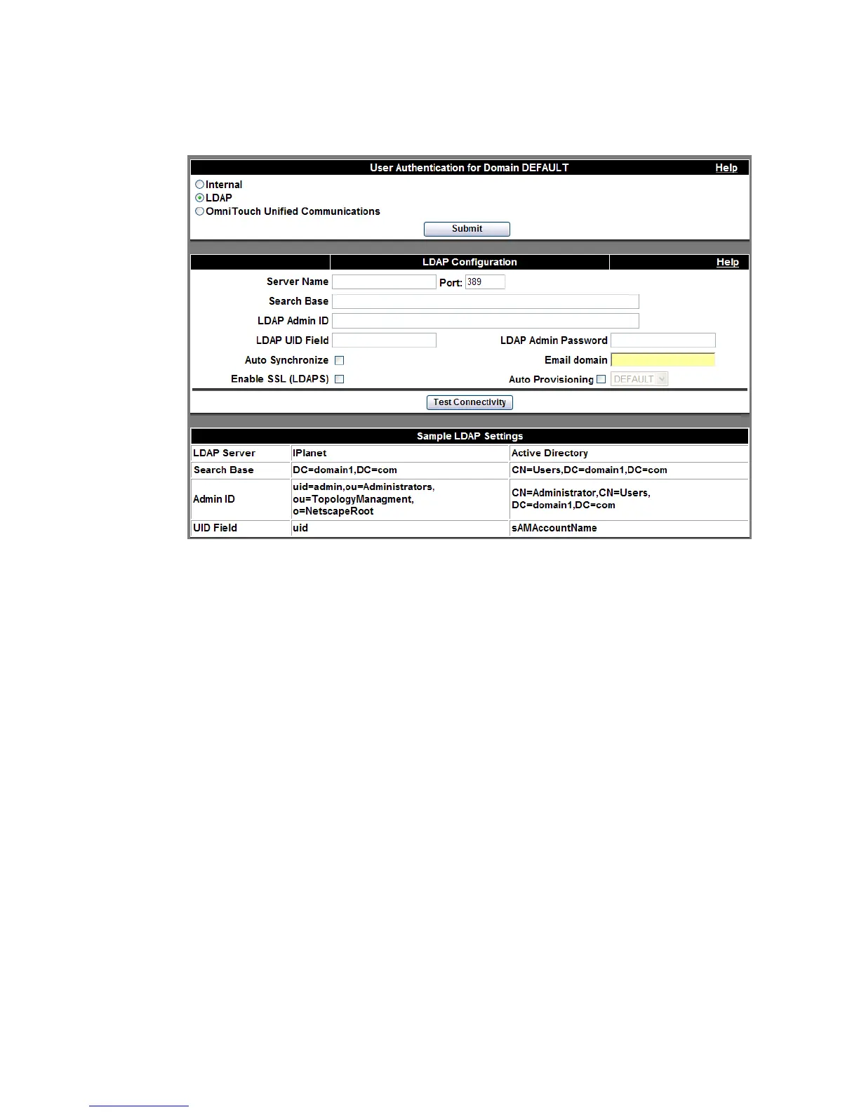Shown are sample LDAP configuration options for the iPlanet LDAP directory and