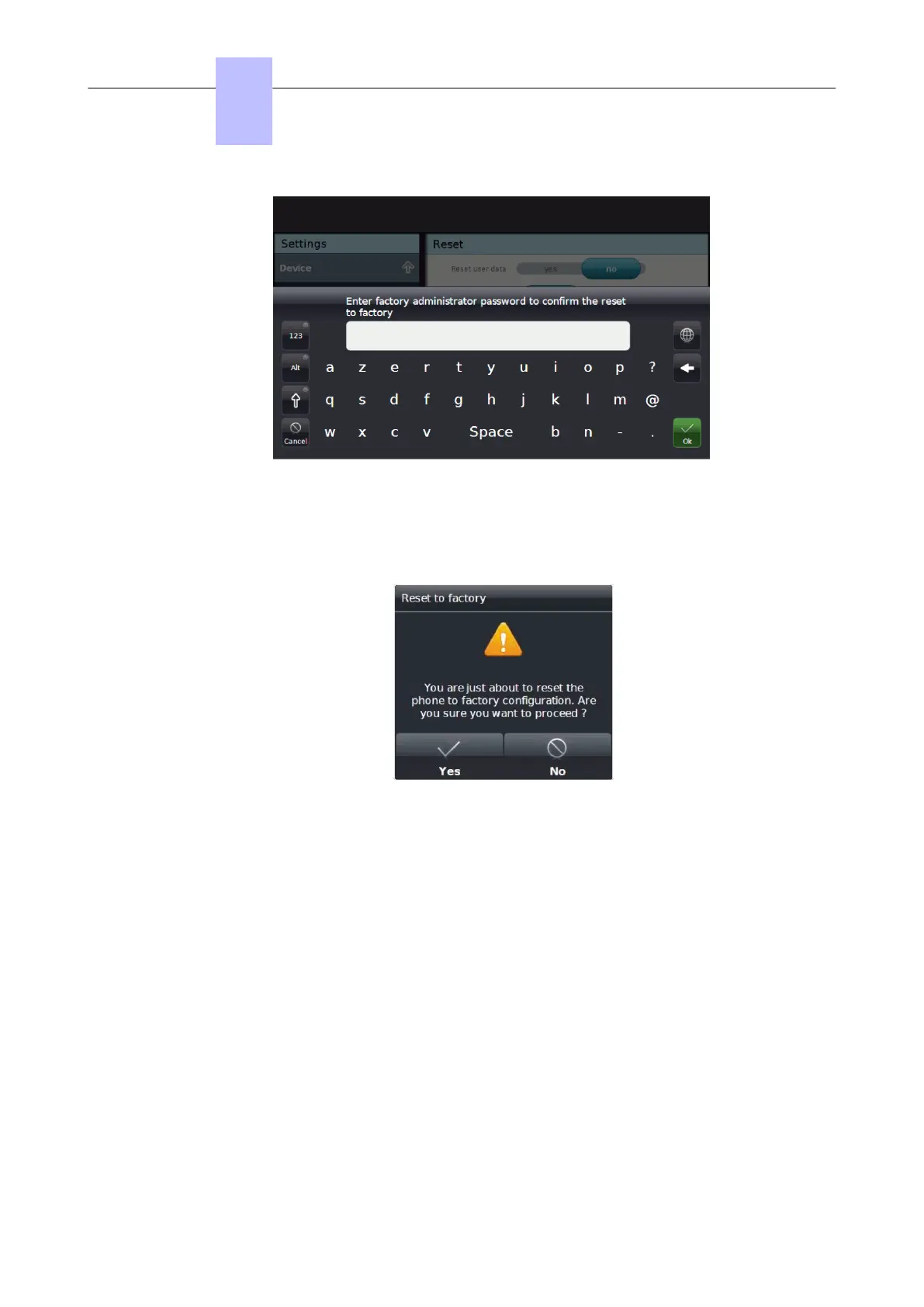 6. Press Yes to confirm the reset to factory: reset to factory is performed and the set restarts