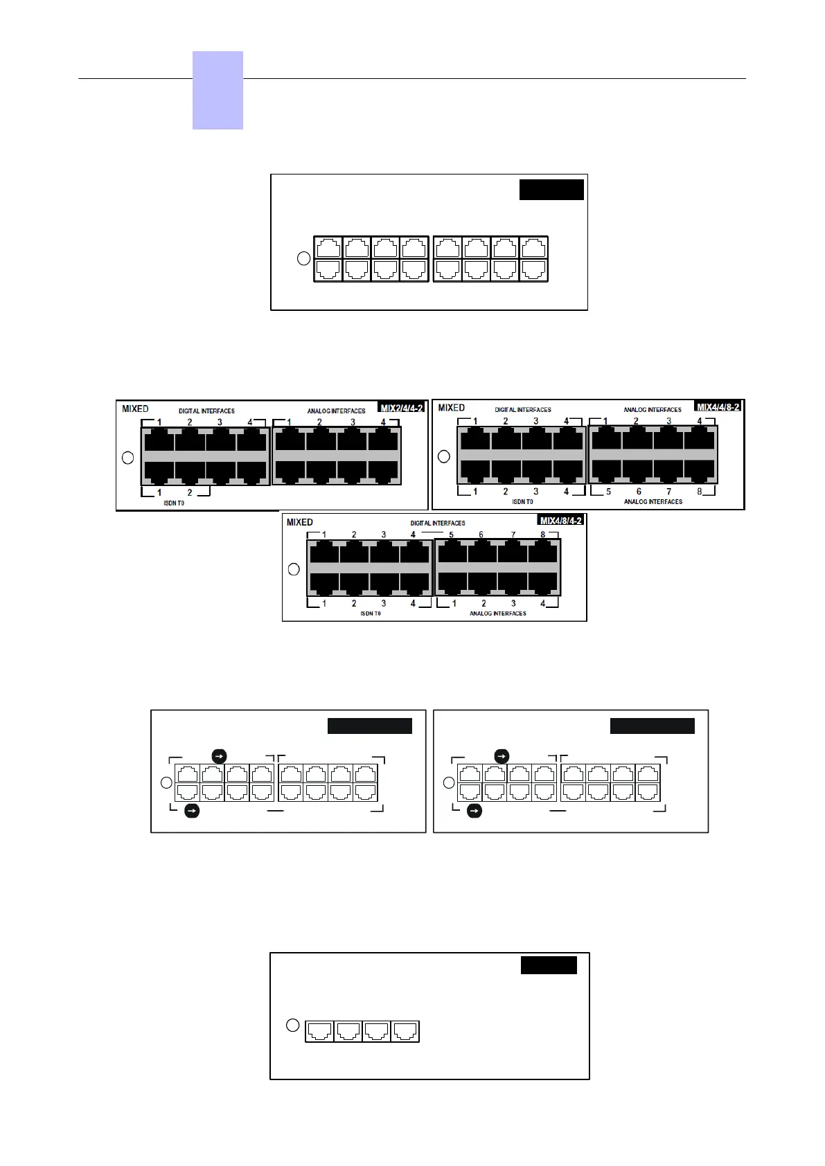 These boards are used to connect 4 analog accesses, 4 or 8 analog terminals and 4 or 8 digital