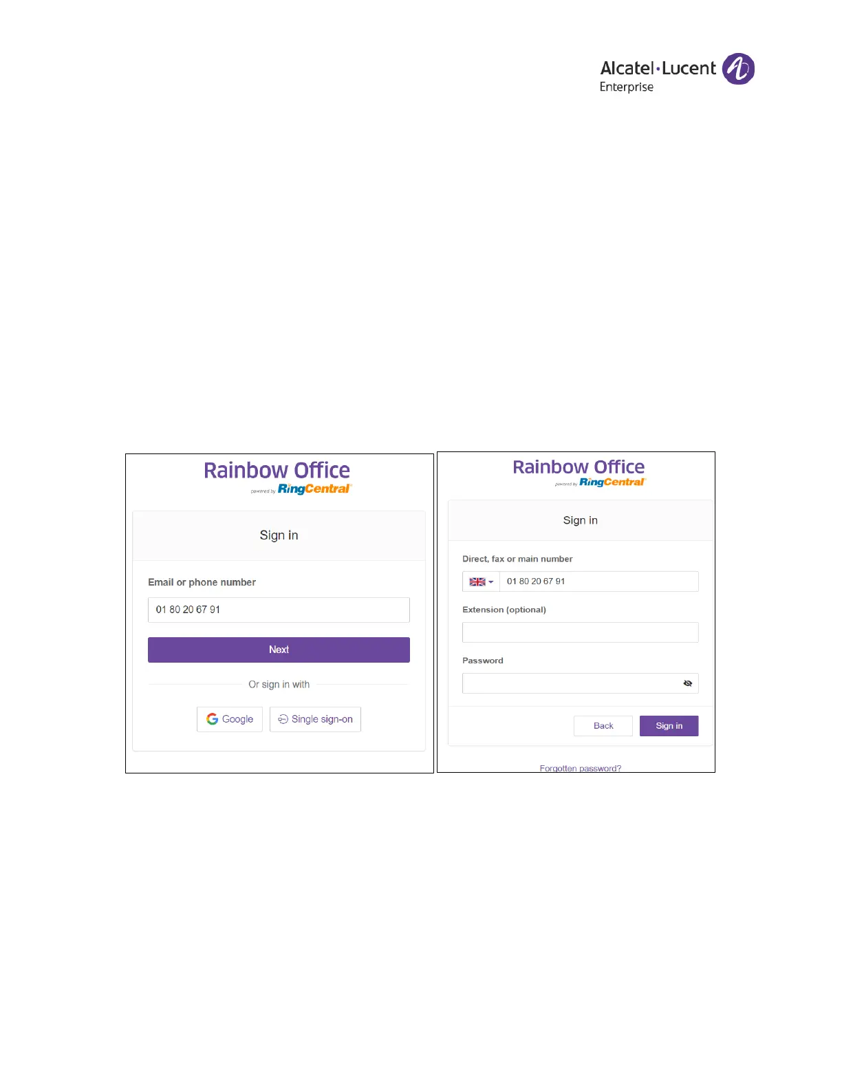1. Enter your Rainbow Office phone number