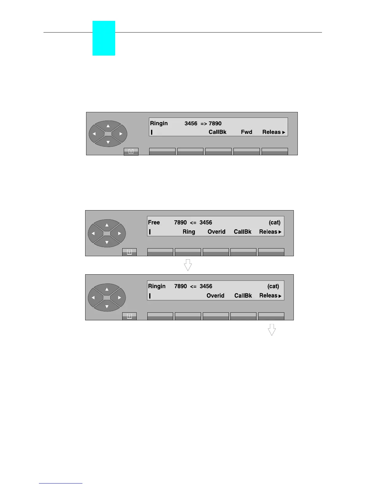 By pressing the «Ring» key, the forwarded set is rung and the attendant set display shows that