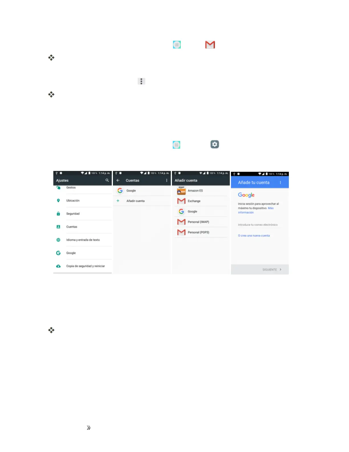 EnlapantalladeInicio,toqueAplicaciones >Ajustes >Cuentas>Añadir cuenta.