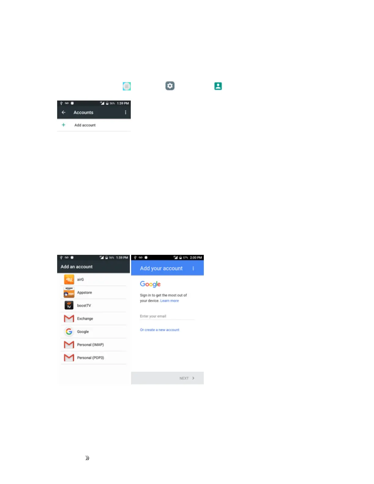Fromhome,tapApps >Settings >Accounts >Add account.