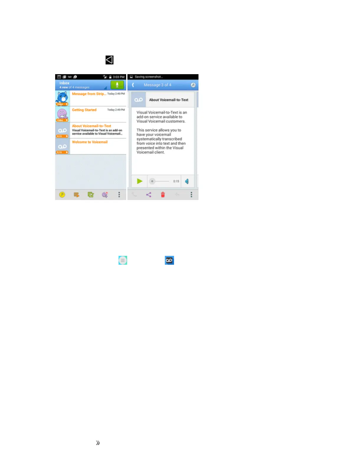 Yourvisualvoicemailoptionsappearasiconsatthebottomofthevoicemailreviewscreen.
