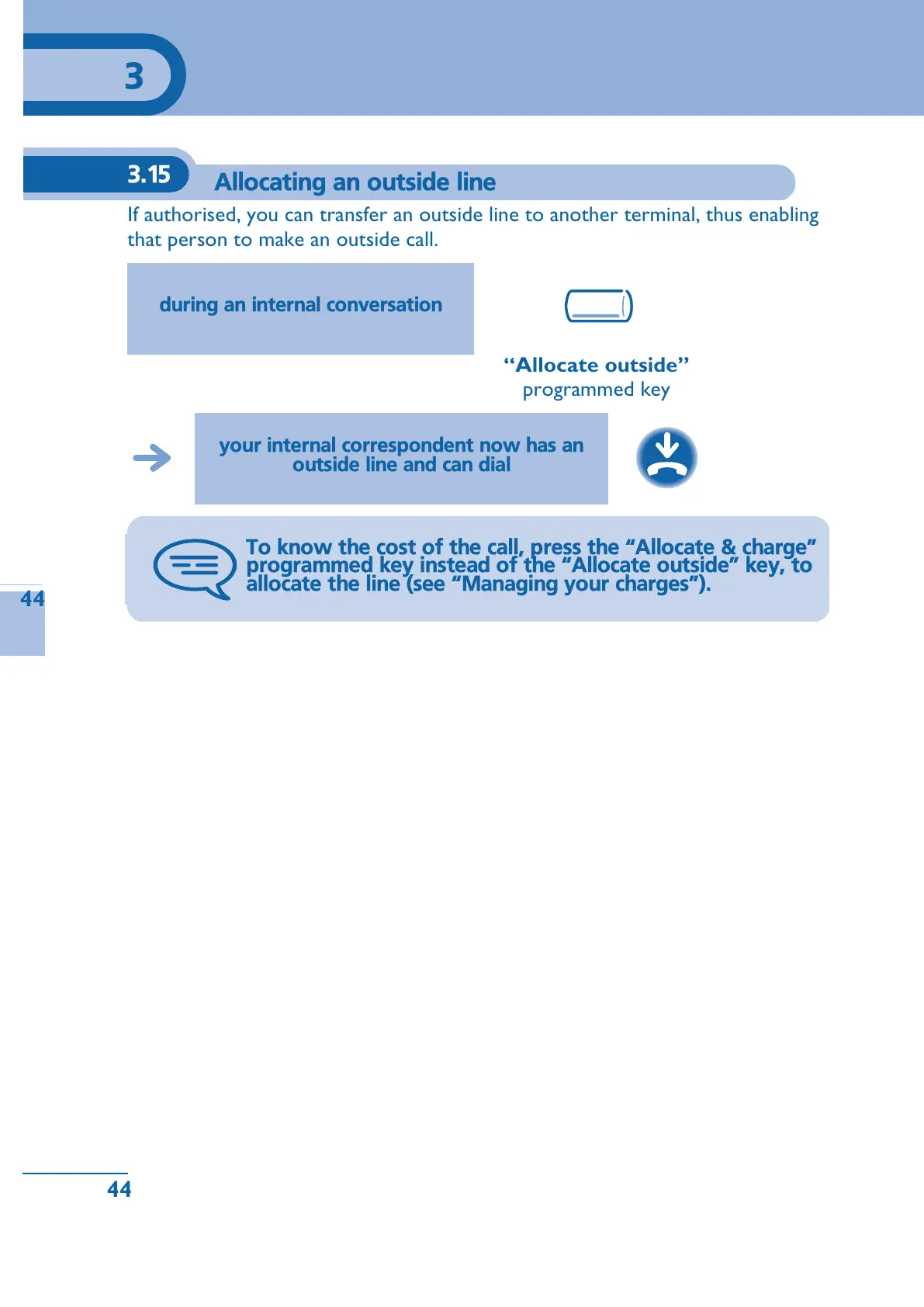 If authorised, you can transfer an outside line to another terminal, thus enabling