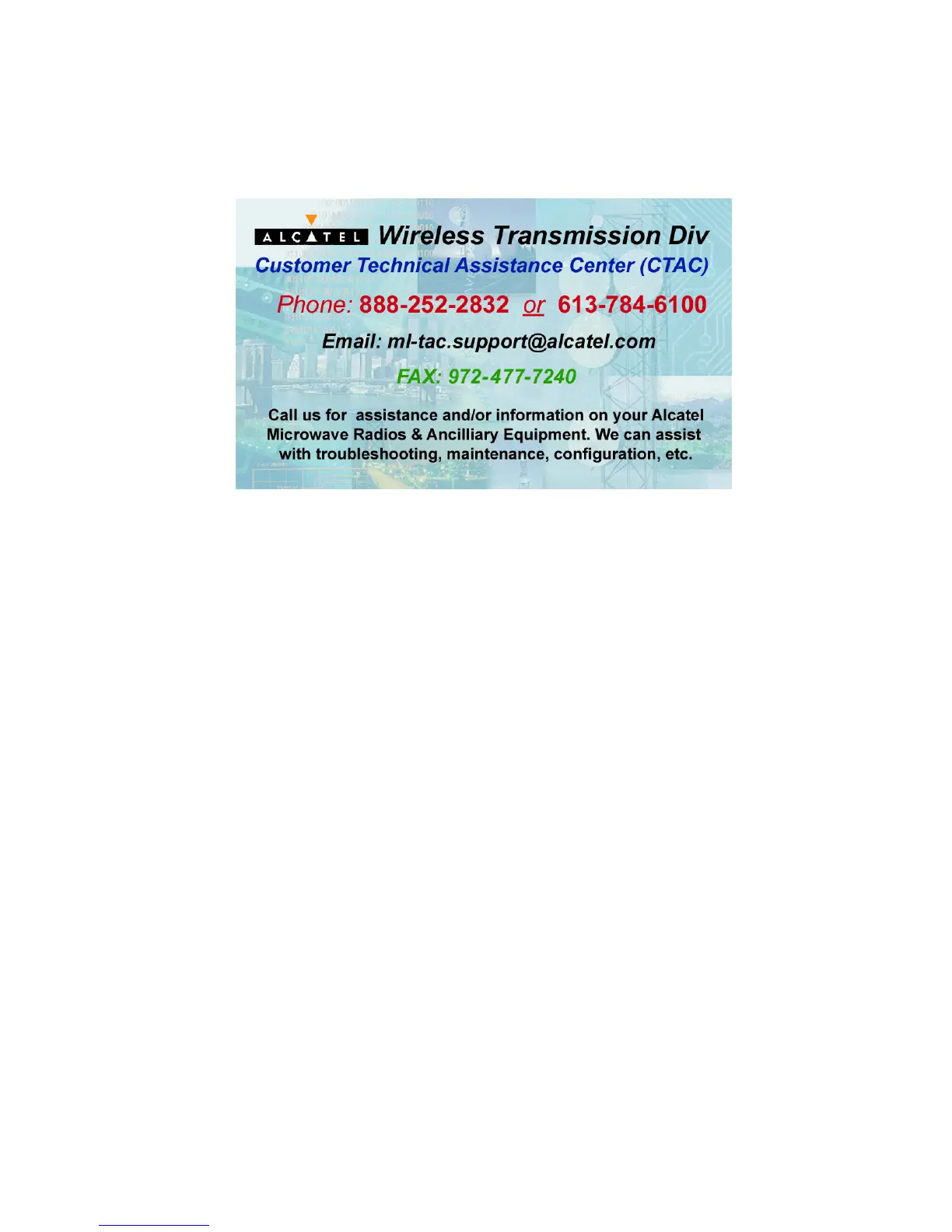 The ALCATEL call center (888) 252-2832 is available 24 hours per day, seven days per week