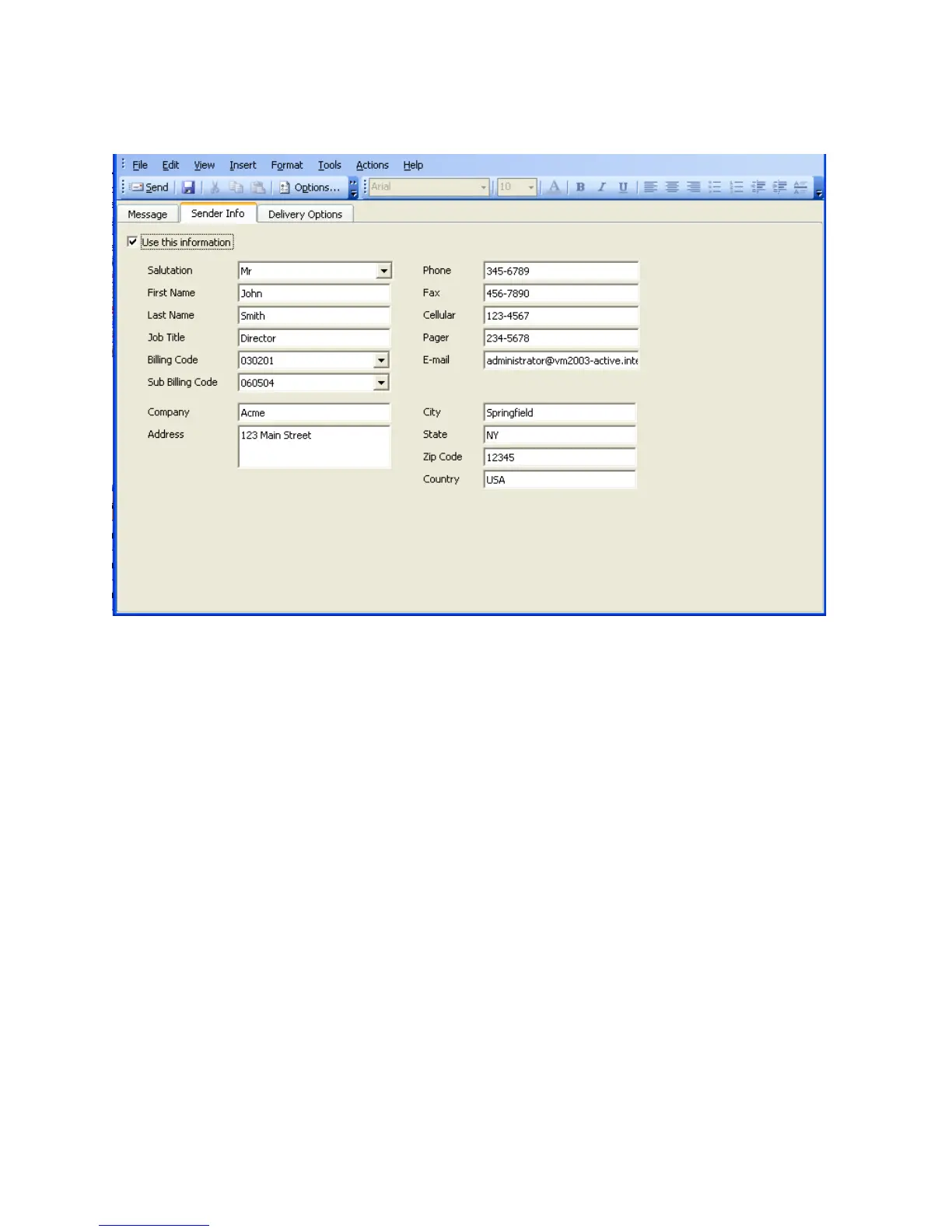 correspond to the fields in the Sender Information form. That