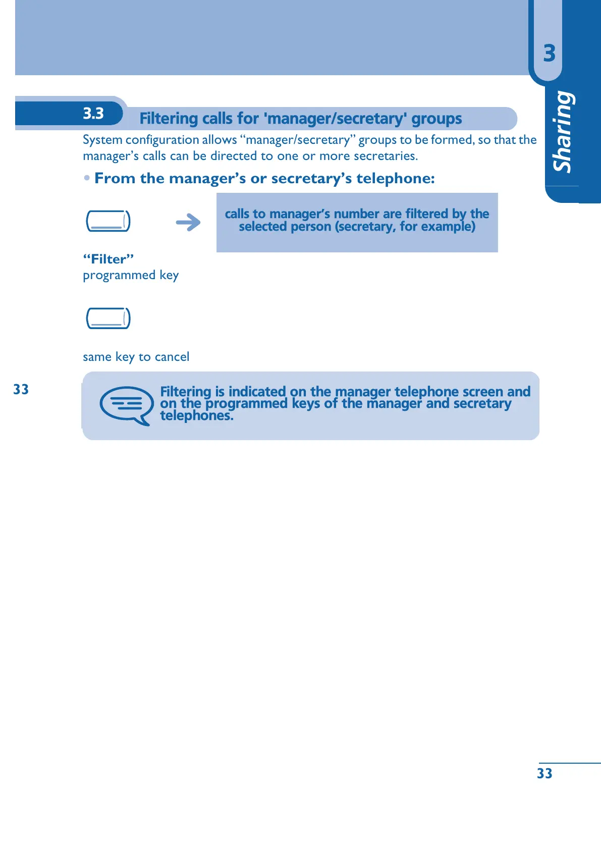 Filtering is indicated on the manager telephone screen and