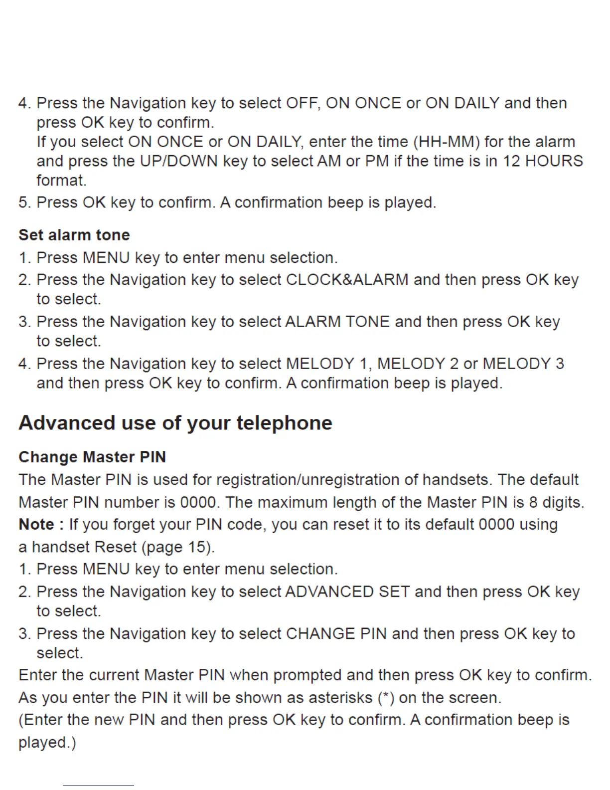 Alcatel Versatis E150 - Advanced Telephone Settings; Setting Alarm Tone; Changing Master PIN