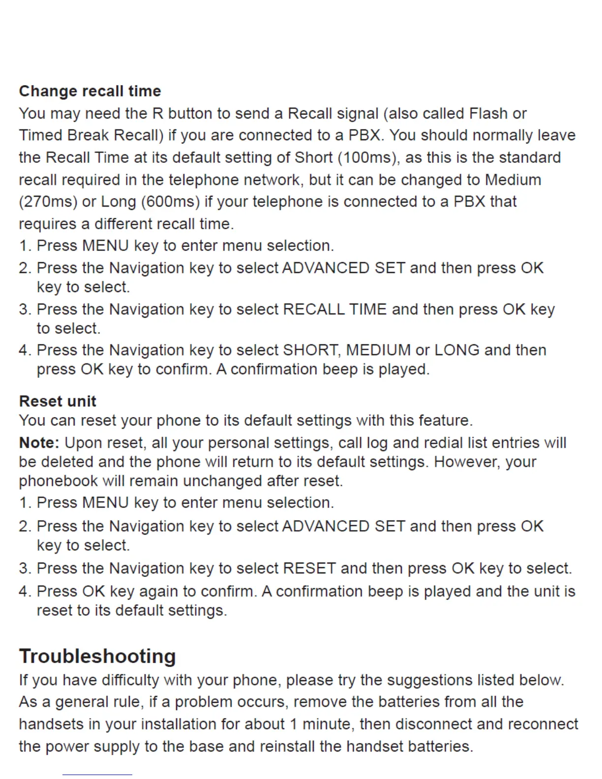 Alcatel Versatis E150 - System Configuration and Troubleshooting; Changing Recall Time and Resetting Unit; Troubleshooting Common Issues