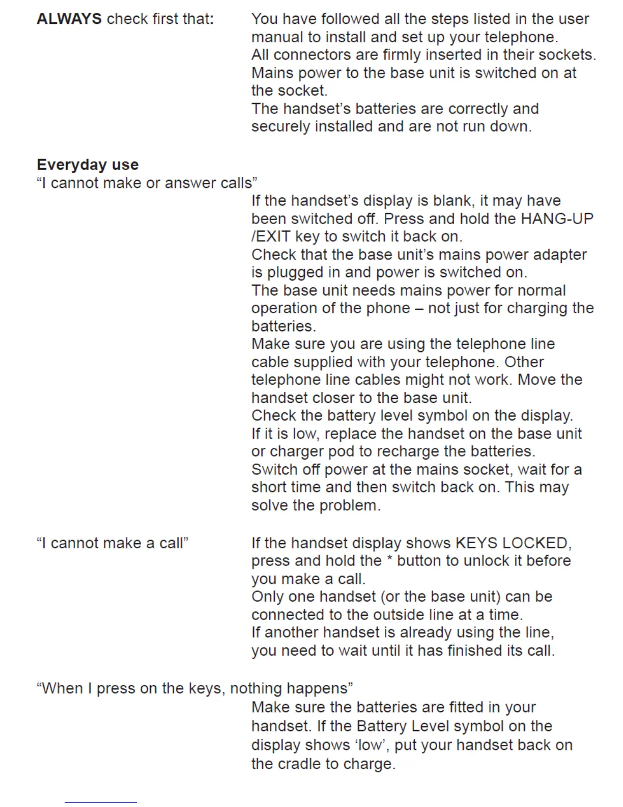 Alcatel Versatis E150 - Everyday Use and Problem Solving; Initial Checks and Cannot Make Calls; Keypad Locked and Line Usage