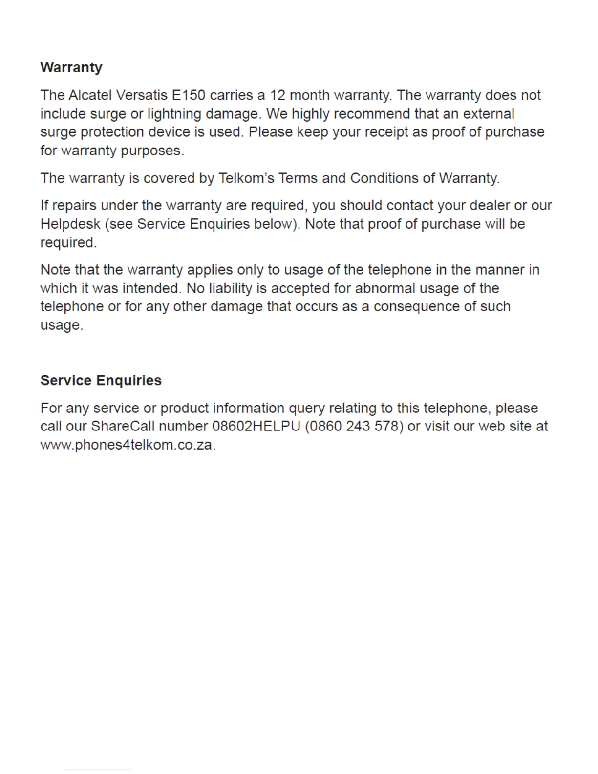 Alcatel Versatis E150 - Warranty and Service Information; Product Warranty Details; Service Enquiries and Support