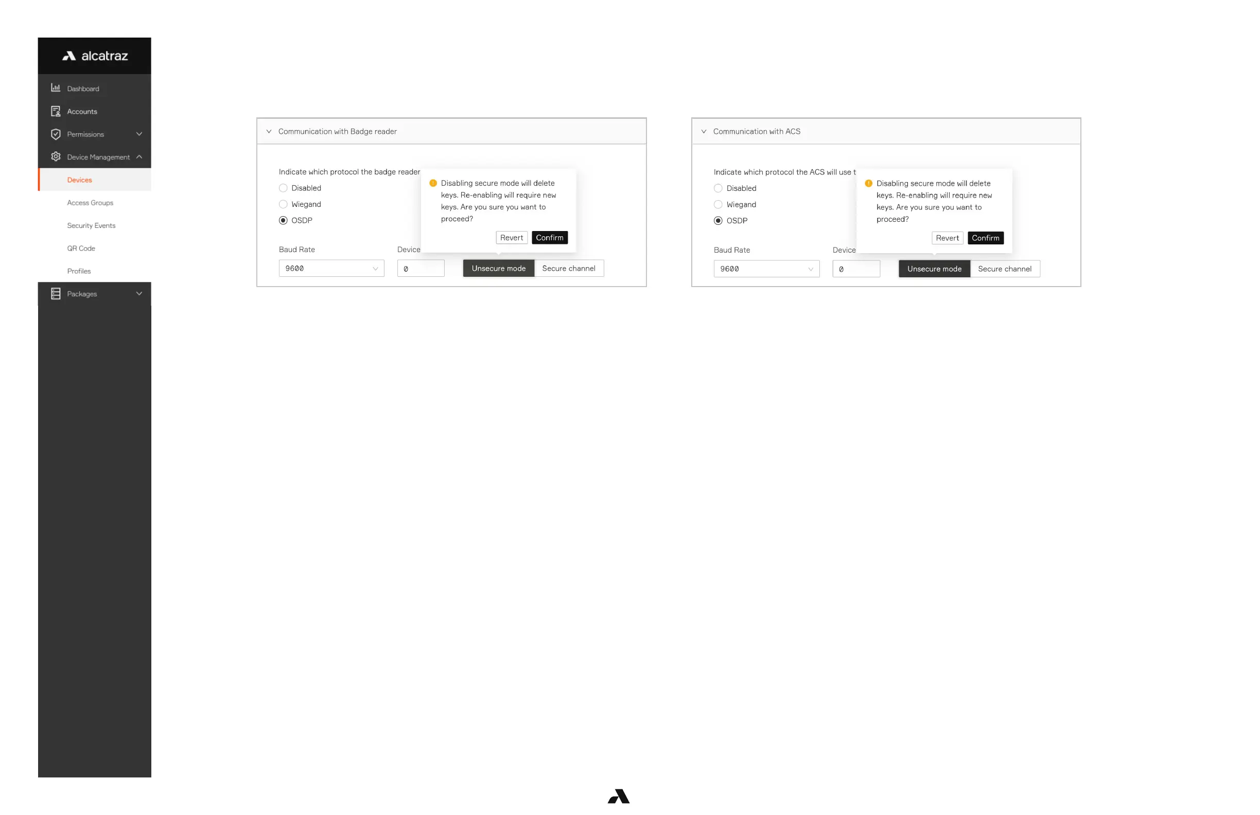 OSDP requires the exchange of encryption keys. To change from secure channel to unsecure channel, the keys will be