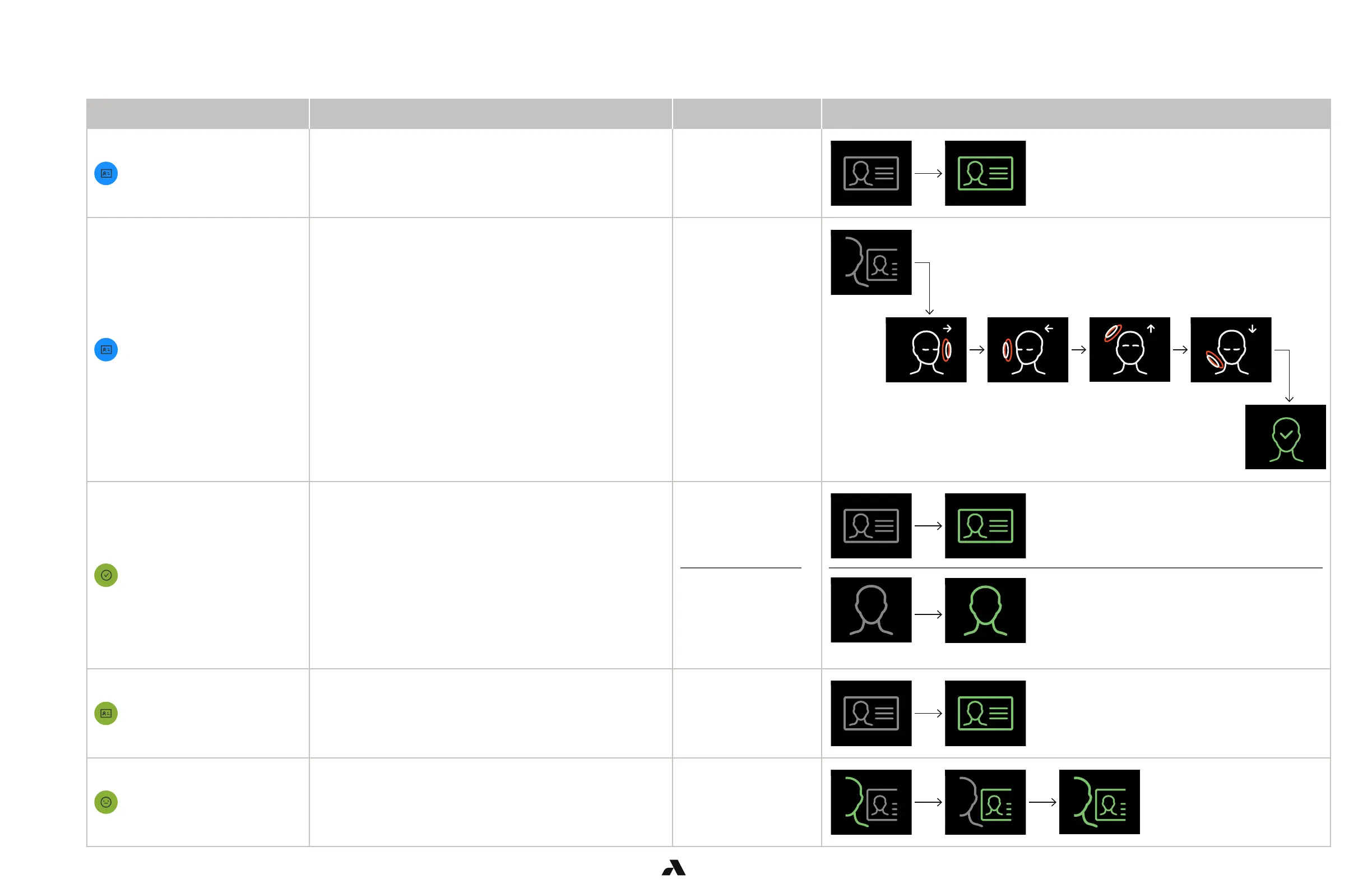 The table summarizes the most common security events displayed in the Alcatraz AI Admin Portal and the sequence of icons that can be observed on the Rock’s display.