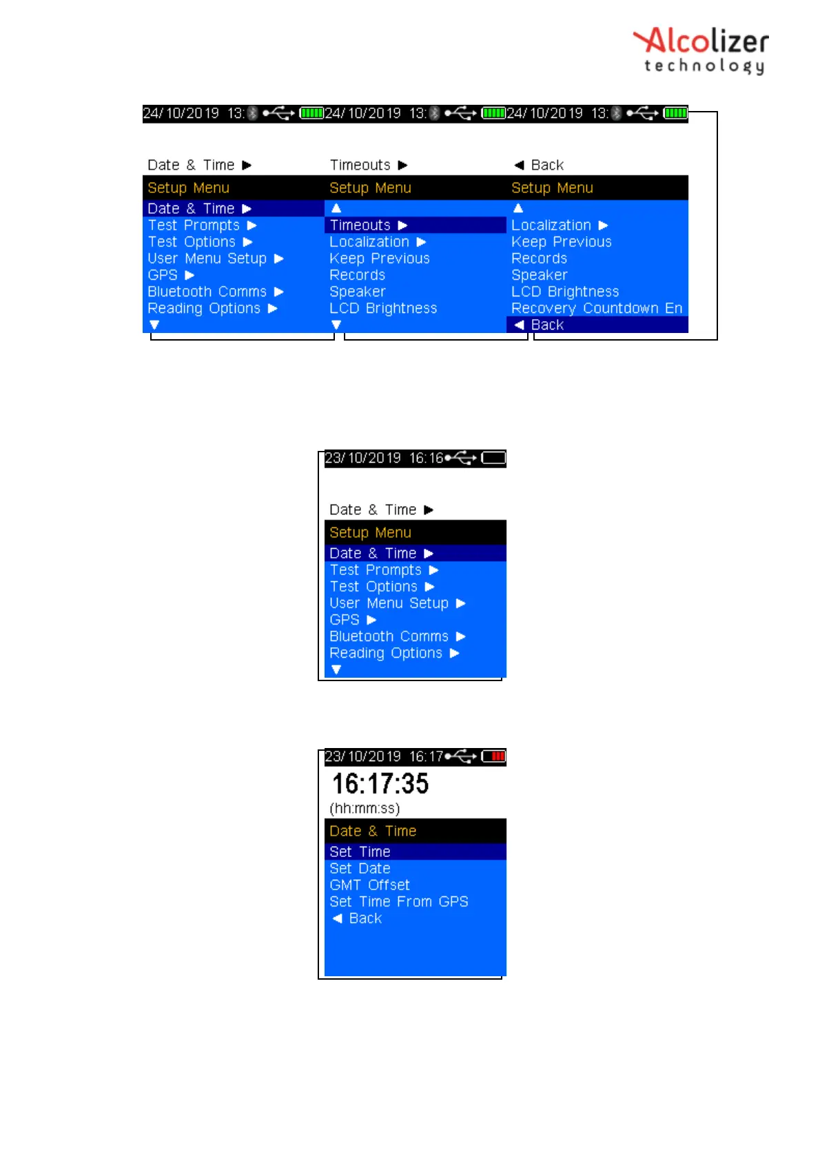 In the Setup Menu use the Up and Down buttons to highlight Date & Time, press the Test Key to