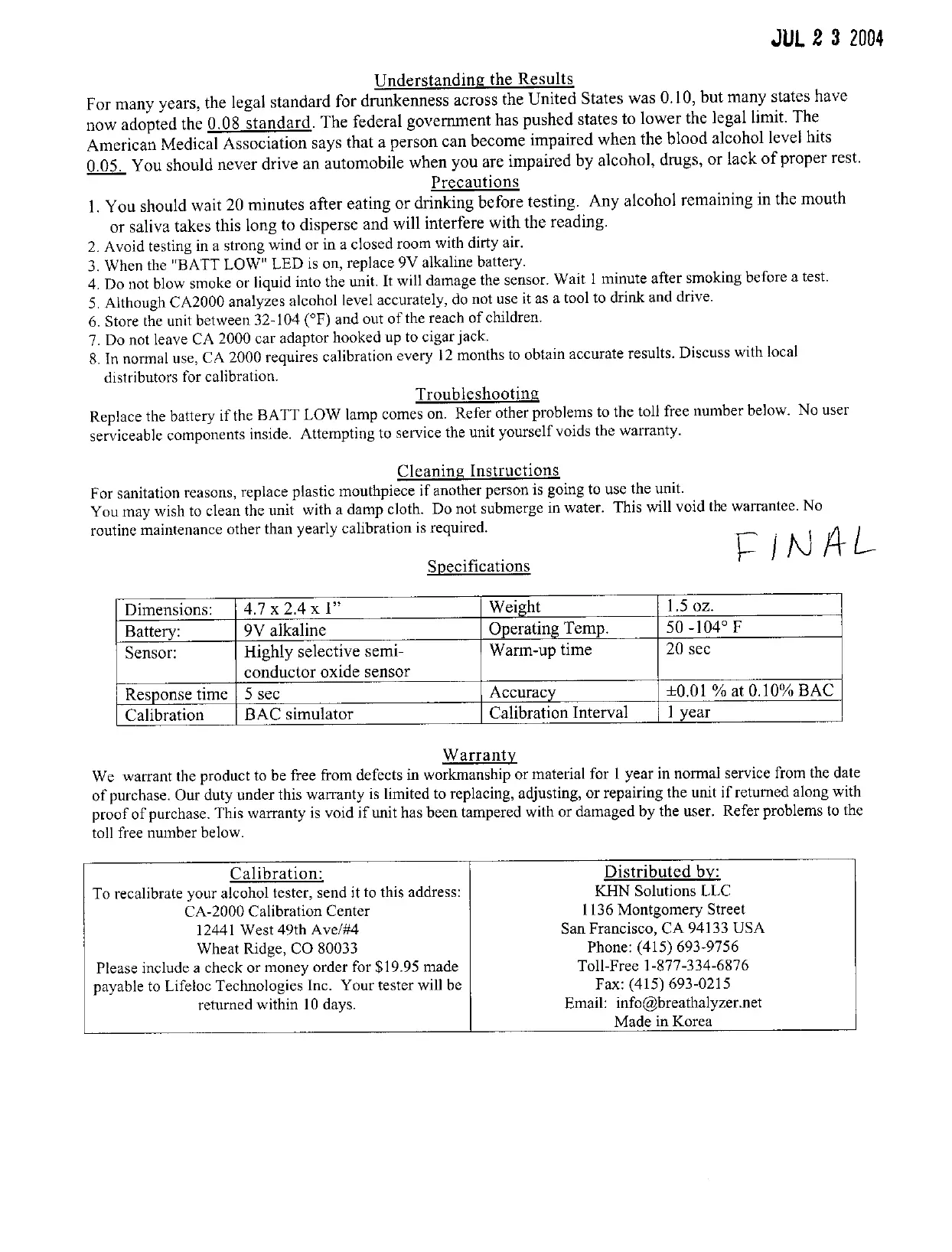 AlcoMate CA 2000 - Understanding and Maintaining Your Device; Understanding Blood Alcohol Results; Safety Precautions for Use; Troubleshooting and Cleaning