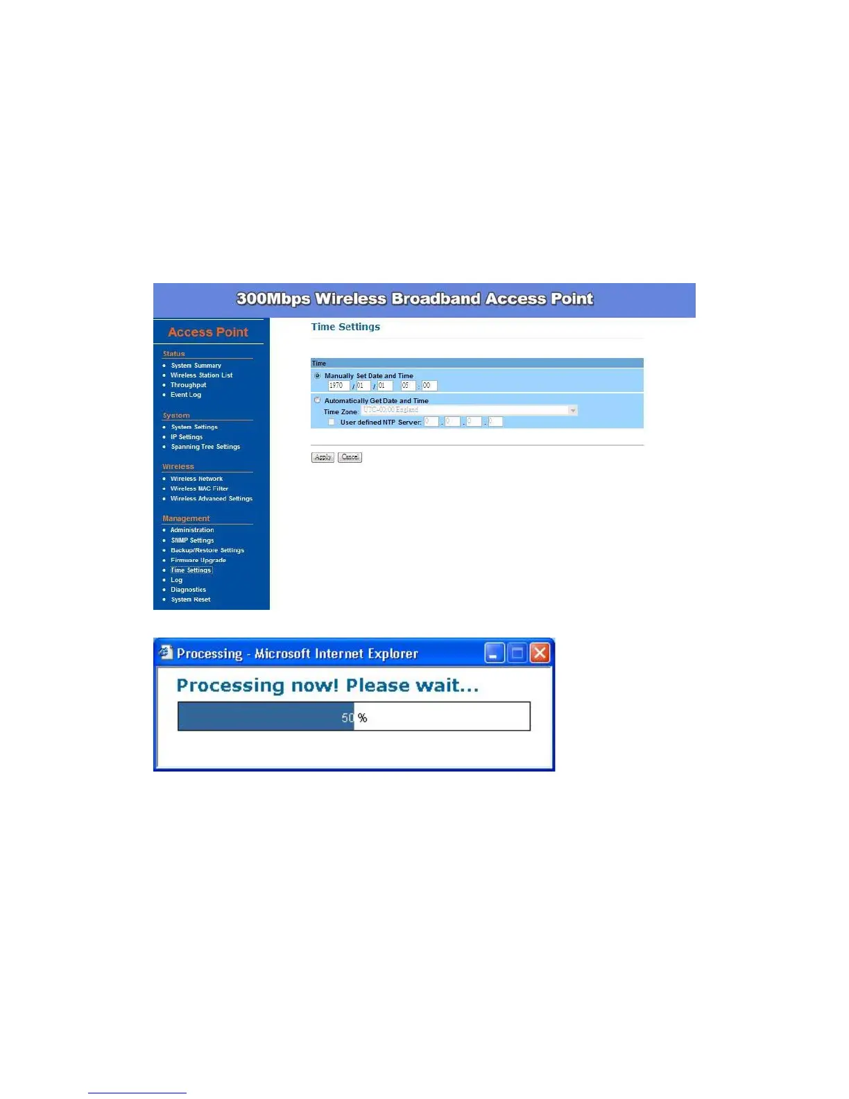 This page allows you to configure the time on the device. You may do this