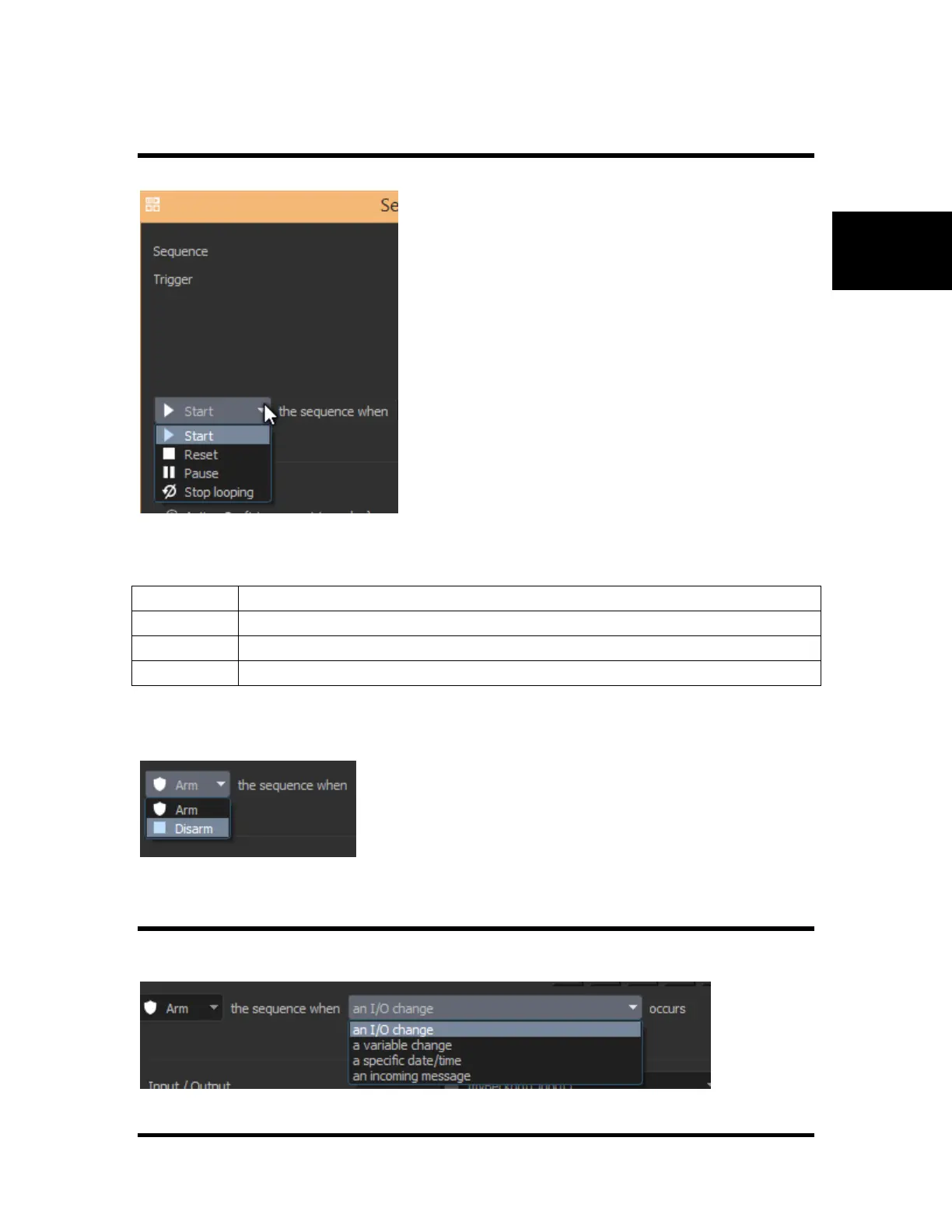 Triggers can start, reset (stop), pause or stop looping a particular sequence.