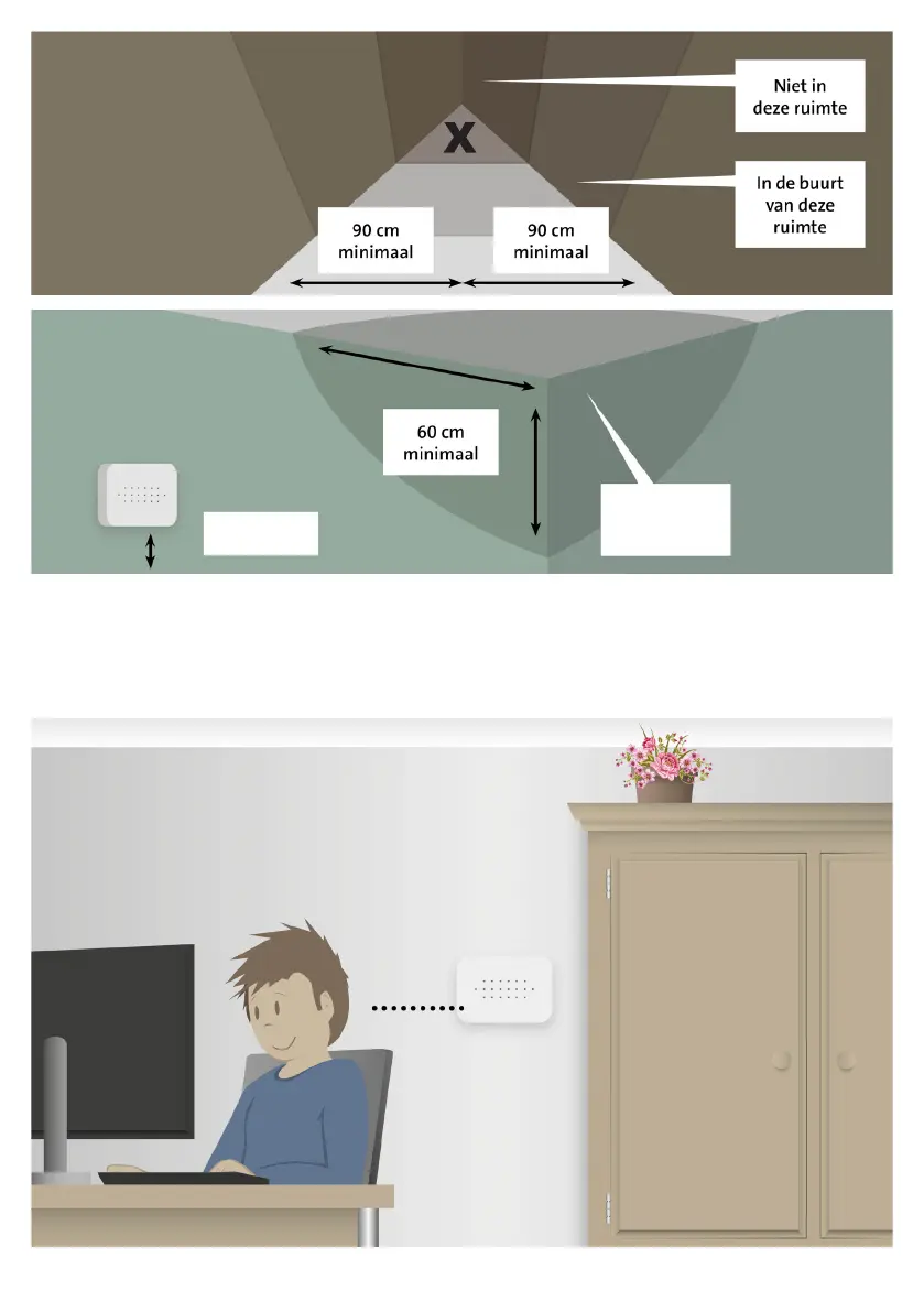 • Installeer de CO-melder 60 centimeter van omliggende muren en plafonds.