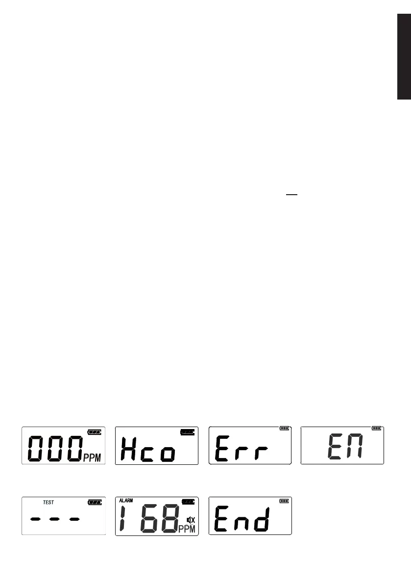 concentratie nog steeds boven 200 PPM is zal het alarm wederom activeren. Druk tijdens de hush functie op de test knop