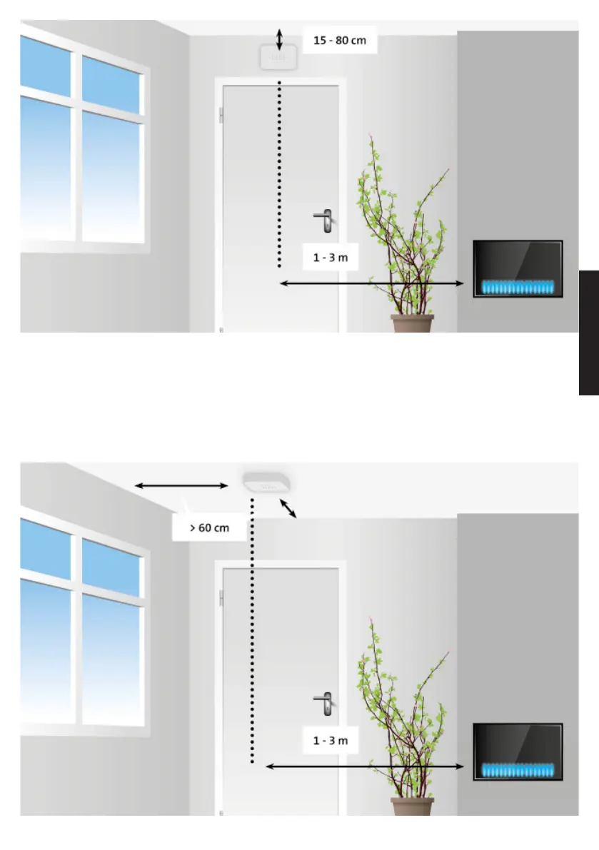 • Bei kleineren Räumen (<4m³) sollte der Detektor außerhalb dieser Räume installiert werden.