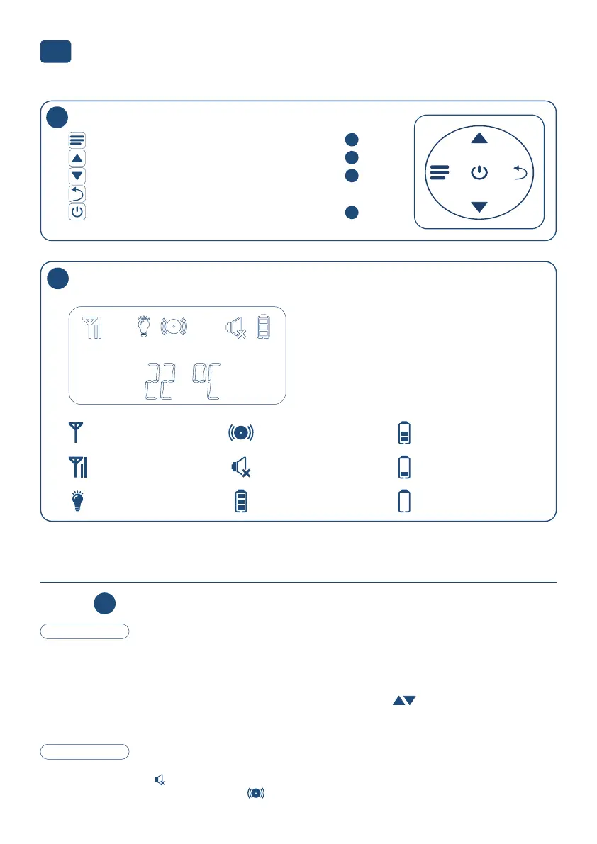 Tegelijkertijd gaat het geluidsalarm icoon knipperen en komt er een geluidje uit de ouder-unit.