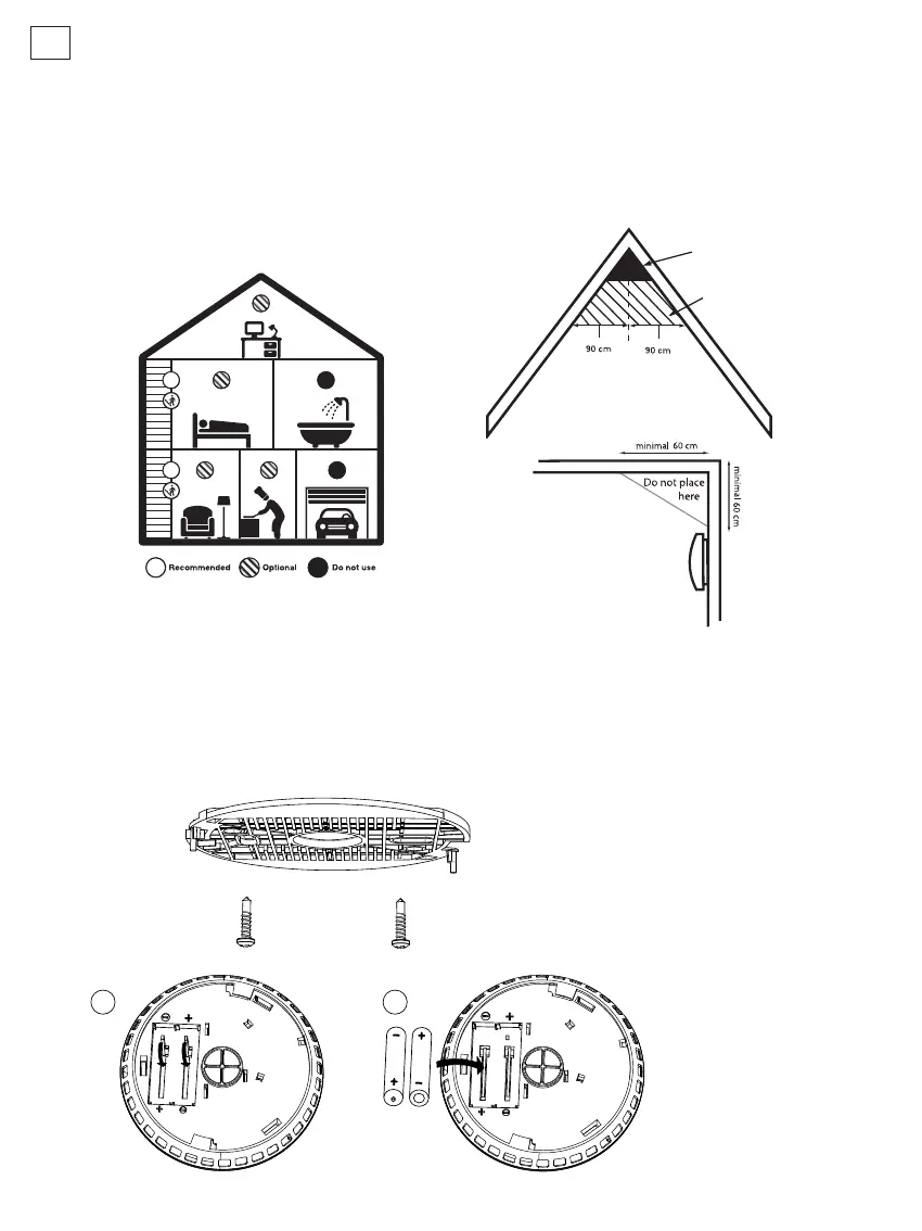 Attach the ceiling plate using the included plugs and screws to the ceiling on a location of choice. Wall mounting is not recommended for smoke
