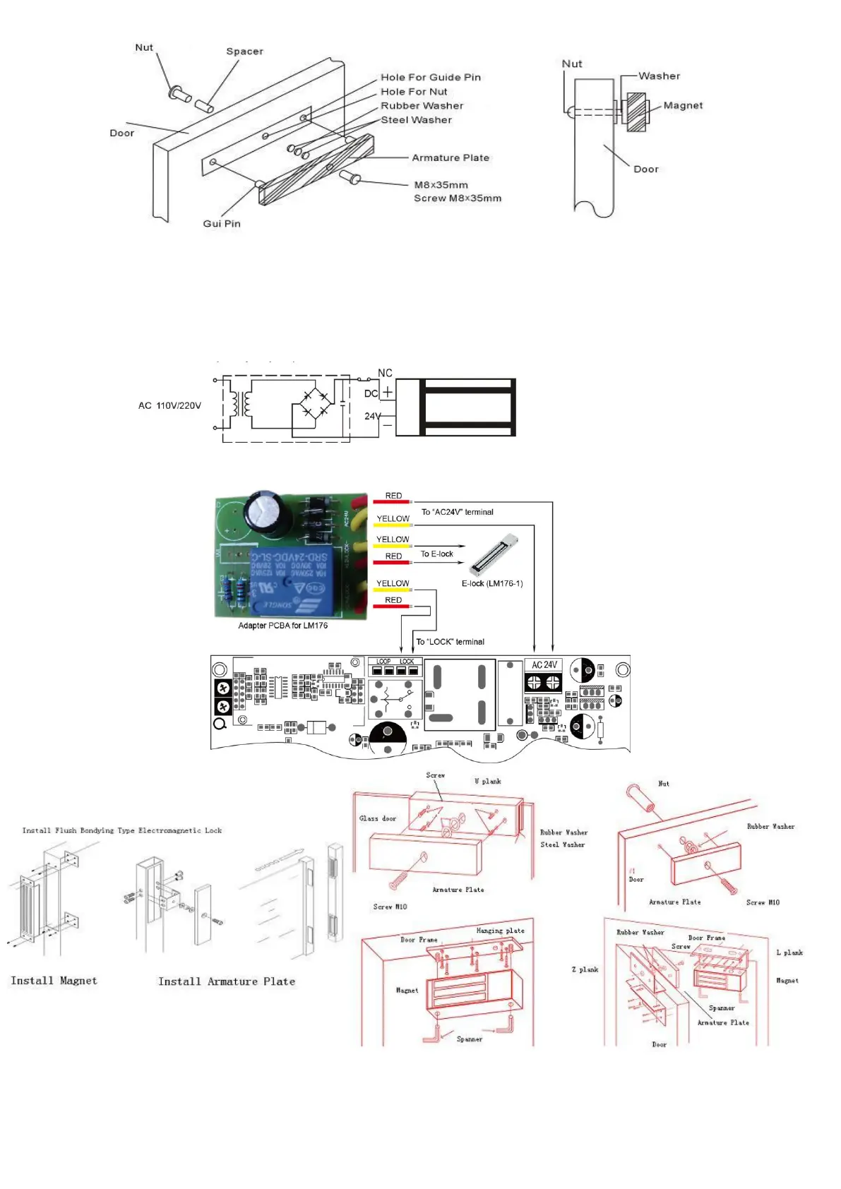 A. Required power 0.5Amp(Maximum). B. Connect the ground (-) lead of 24VDC power source to negative terminal of the E-lock .