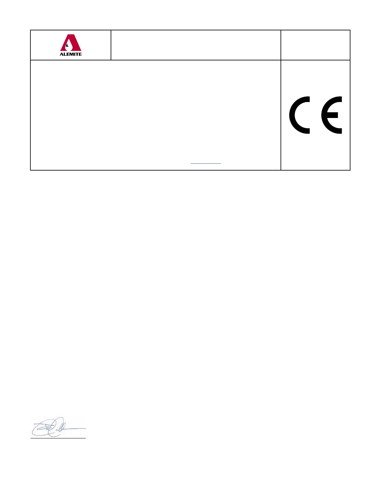 I, the undersigned of Alemite, L.L.C., do hereby declare that the equipment specified above, in its intended use, conforms to the requirements