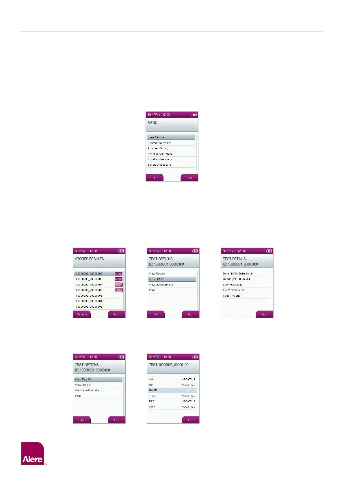 Alere Software Application Suite. Select the test you wish to view using the five way navigation key to scroll