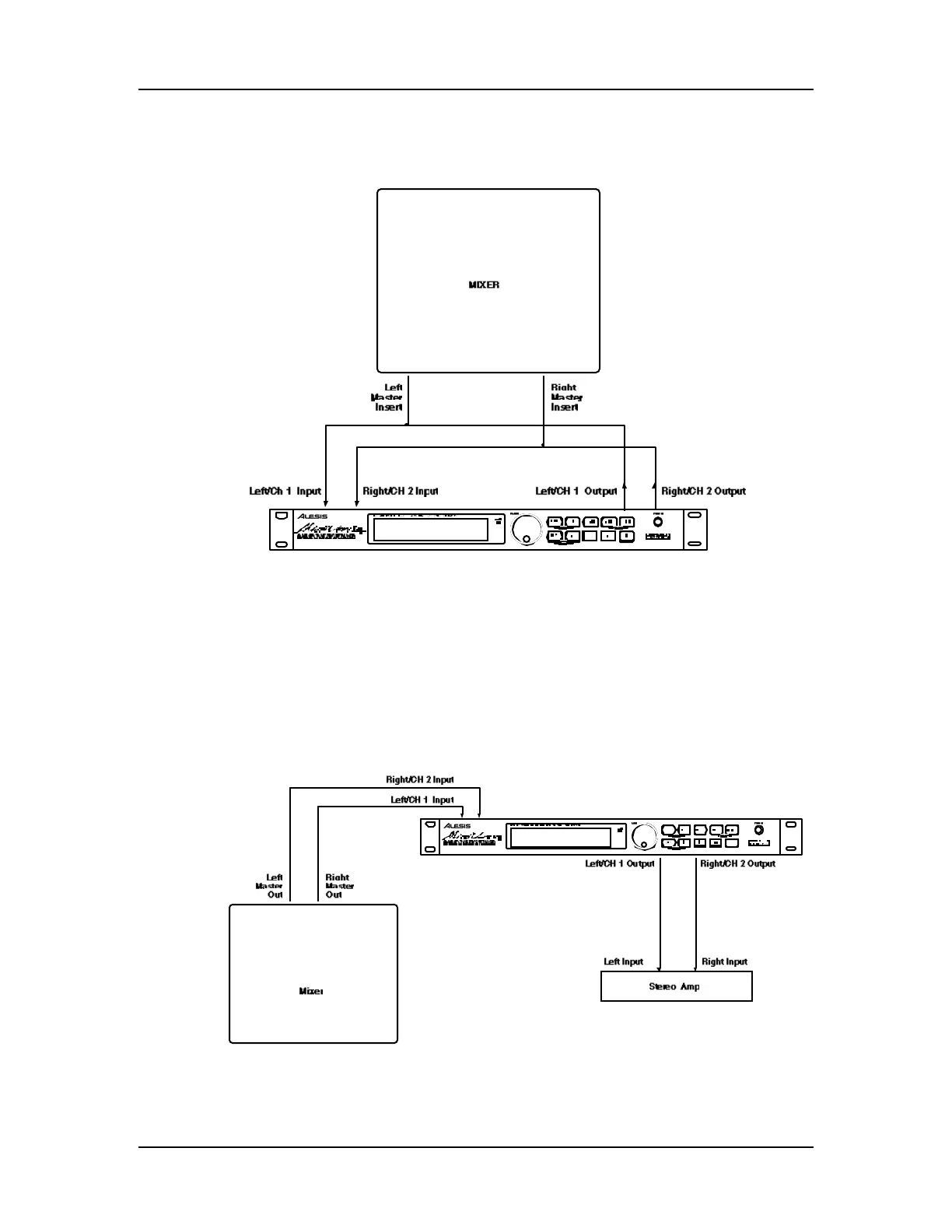 the mixing console to the [LEFT/CH.1] and [RIGHT/CH.2] inputs of the MidiVerb 4.