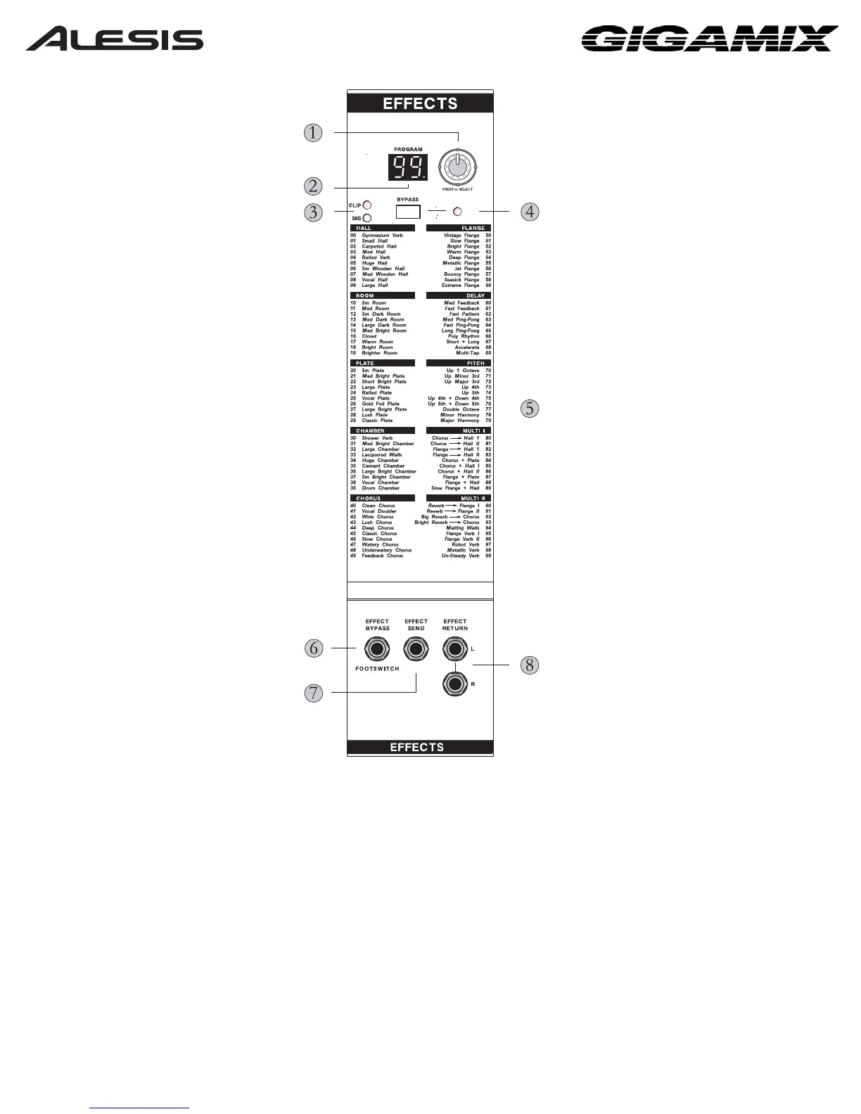 8. I jack EFFECT RETURN riportano l'audio da un dispositivo di effetti esterno al GigaMix.