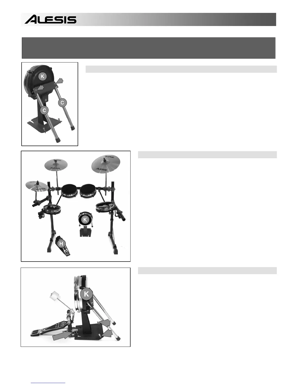 • Place the bass drum pad (K) on the ground. Attach the steel rods (C) to the bass drum pad (K), using the two long screws