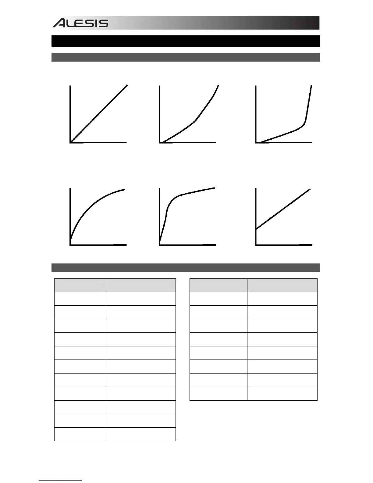 Alesis DM7X - Appendix; Velocity Curves Explained; Pad MIDI Note Numbers Reference