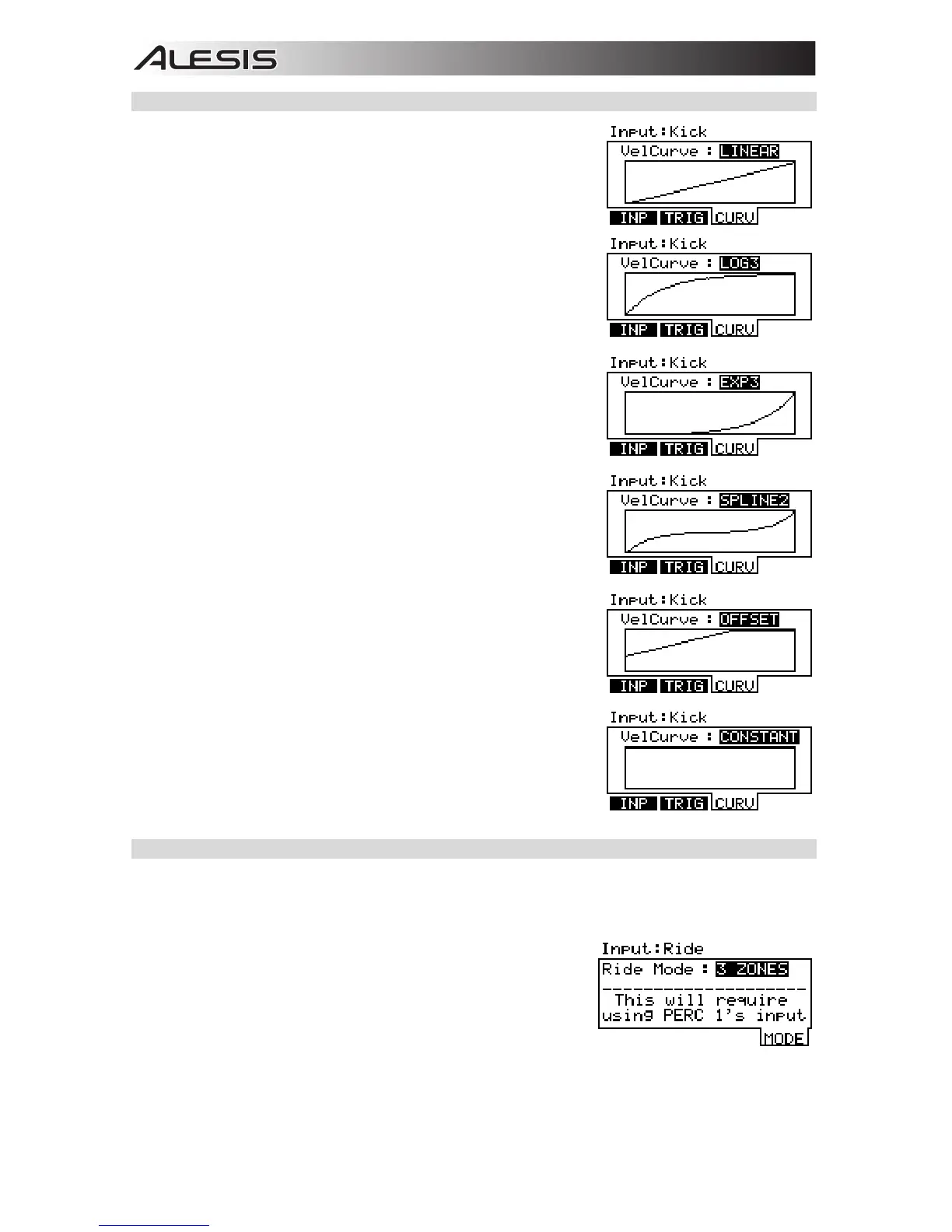 The CURV page lets you set the velocity curve for the triggers, which