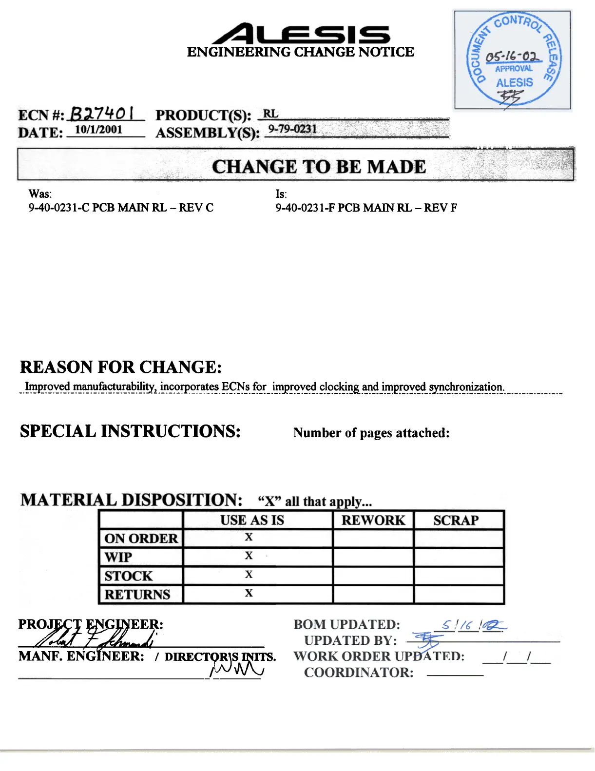 Alesis HD24 - Engineering Change Notice B27401; Change Details; Reason for Change; Special Instructions