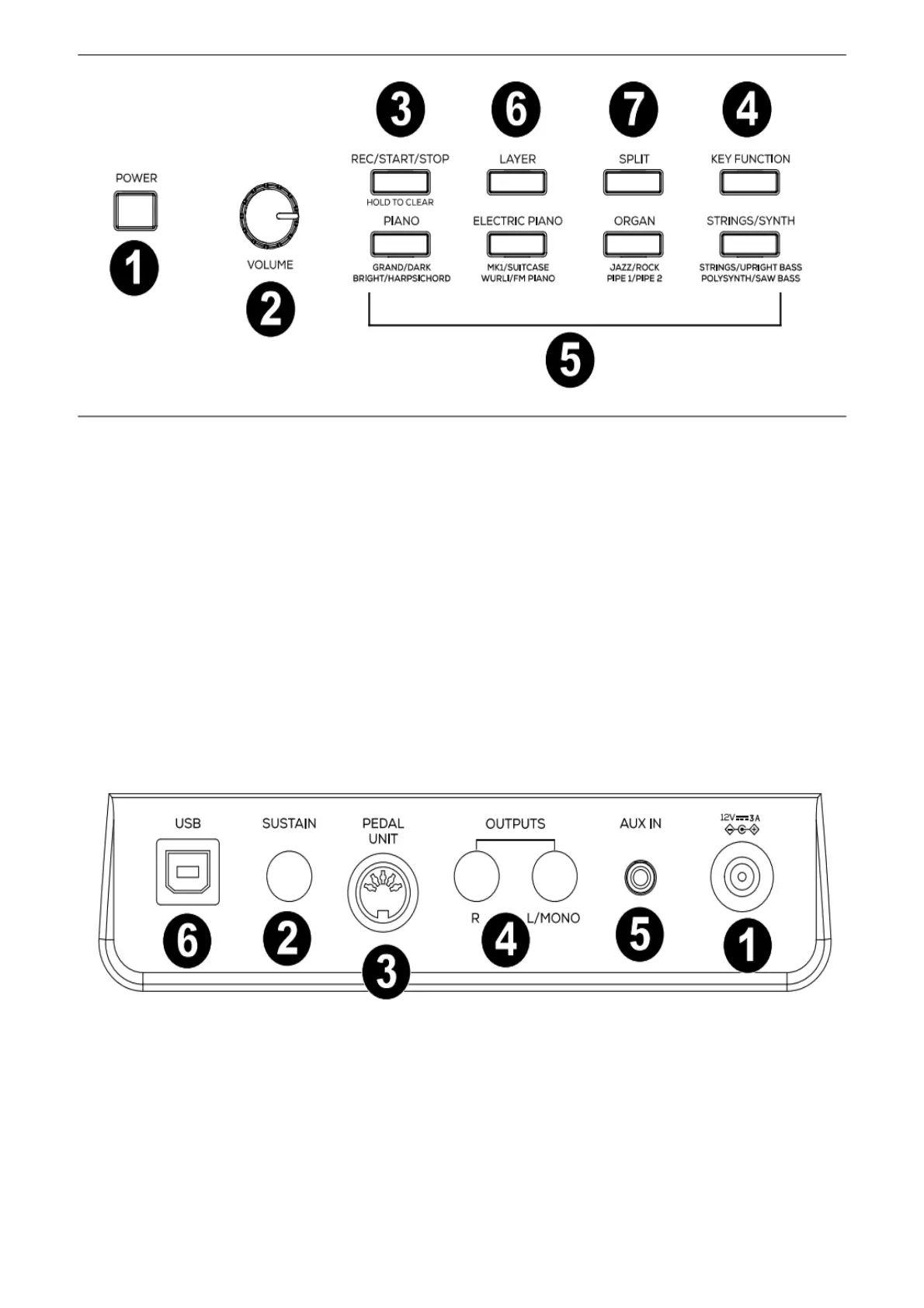 3. Rec/Start/Stop Button: Press this button to arm recording or stop recording a user song, start or stop a user