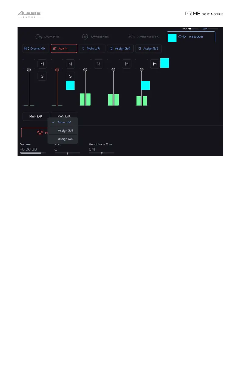 This section routes the Drum Mix, Aux In, Main L/R, Assign 3/4, and Assign 5/6 to