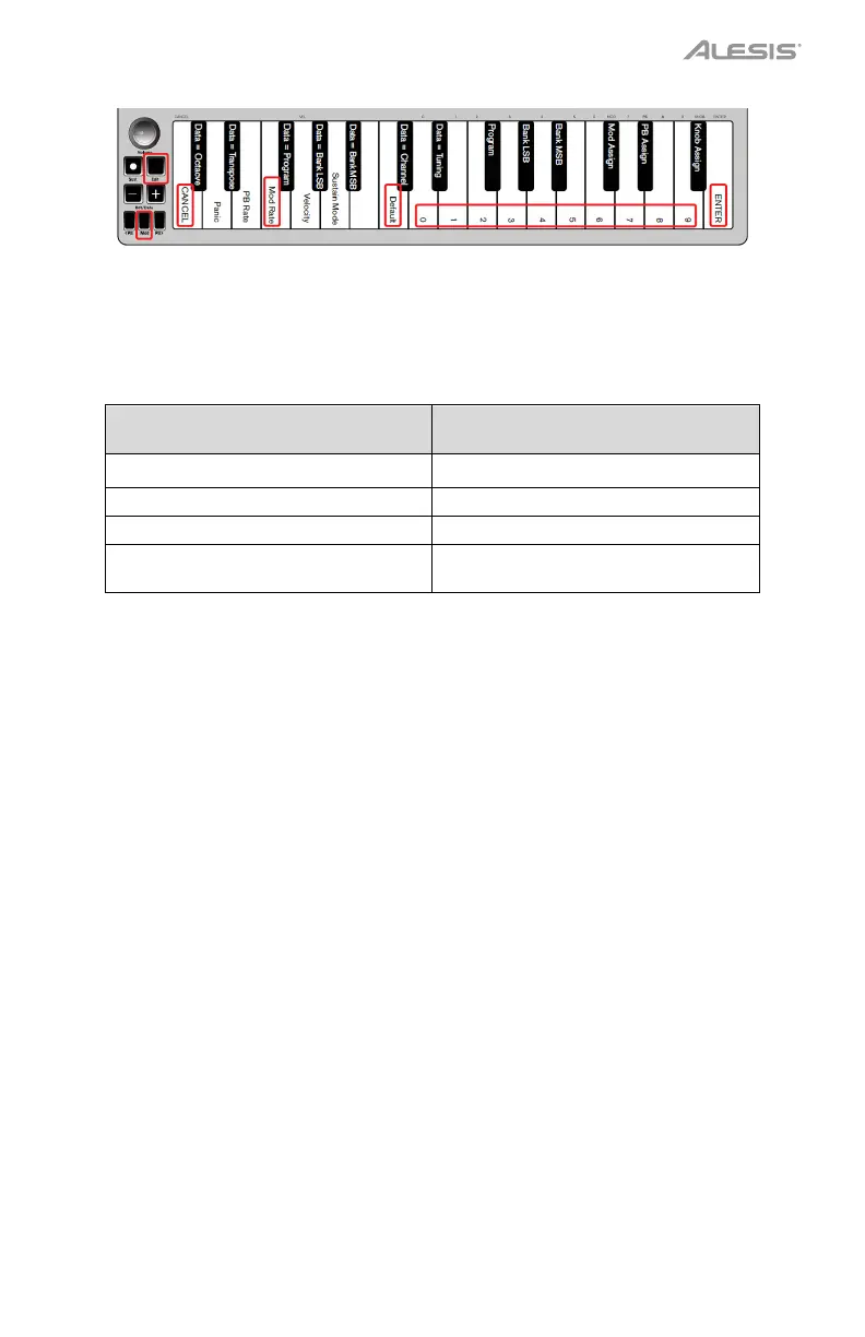 3. Press the “DEFAULT” key (C, 8th white key from the left). The Edit light will dim to half brightness