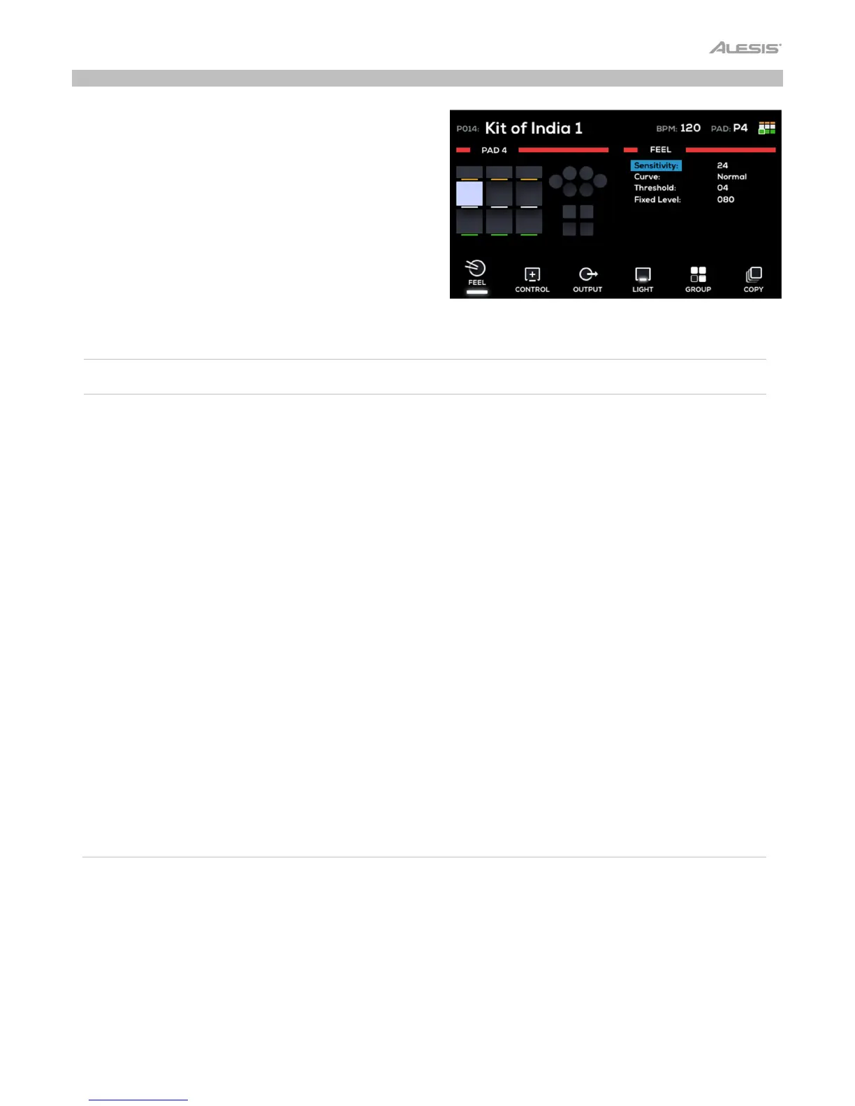 Press the F1–Feel button to adjust the playing dynamics for the pad.